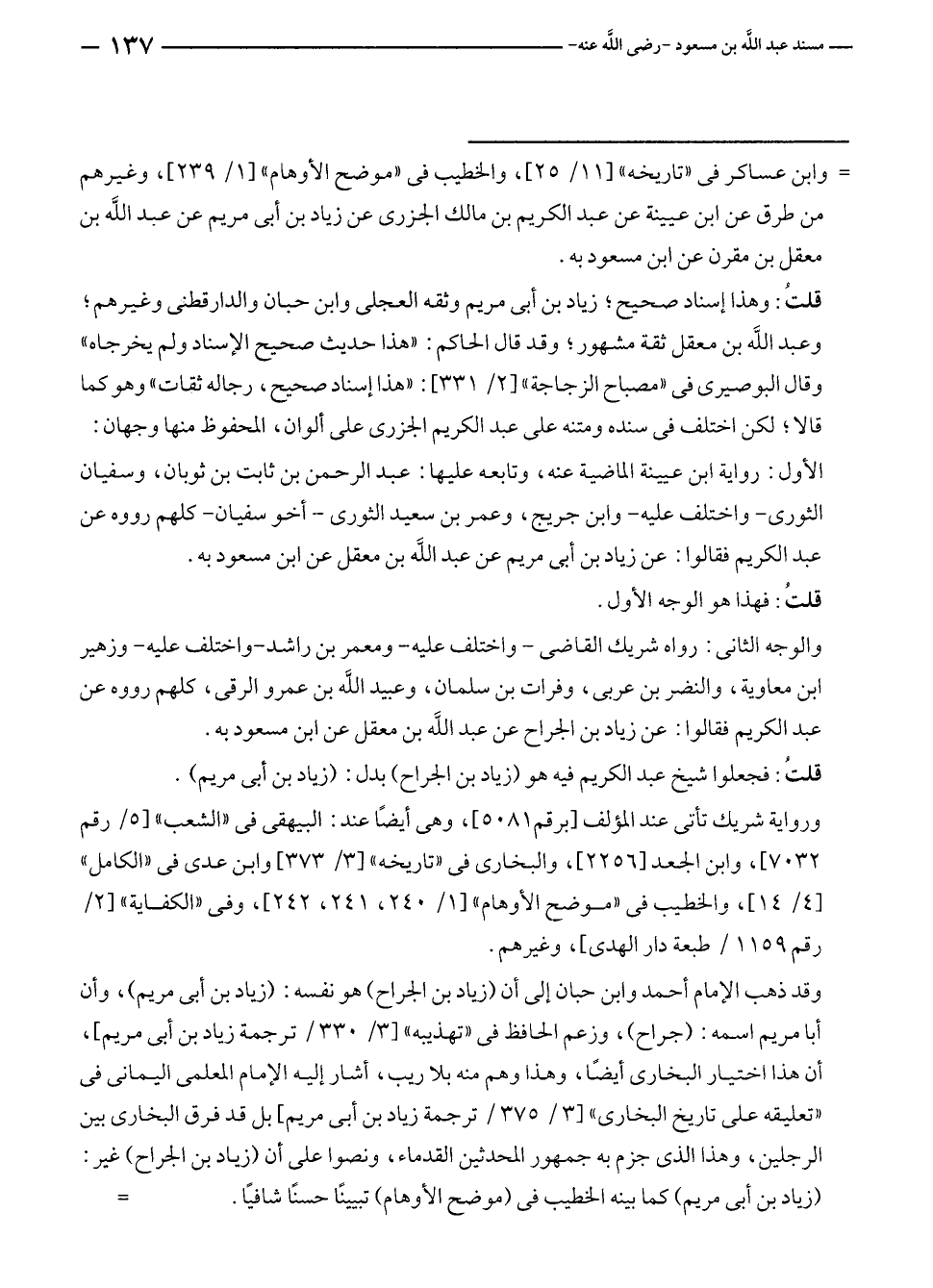 = وابن عساكر في "تاريخه" [١١/ ٢٥]، والخطيب في "موضح الأوهام" [١/ ٢٣٩]، وغيرهم من طرق عن ابن عيينة عن عبد الكريم بن مالك الجزرى عن زياد بن أبى مريم عن عبد الله بن معقل بن مقرن عن ابن مسعود به.