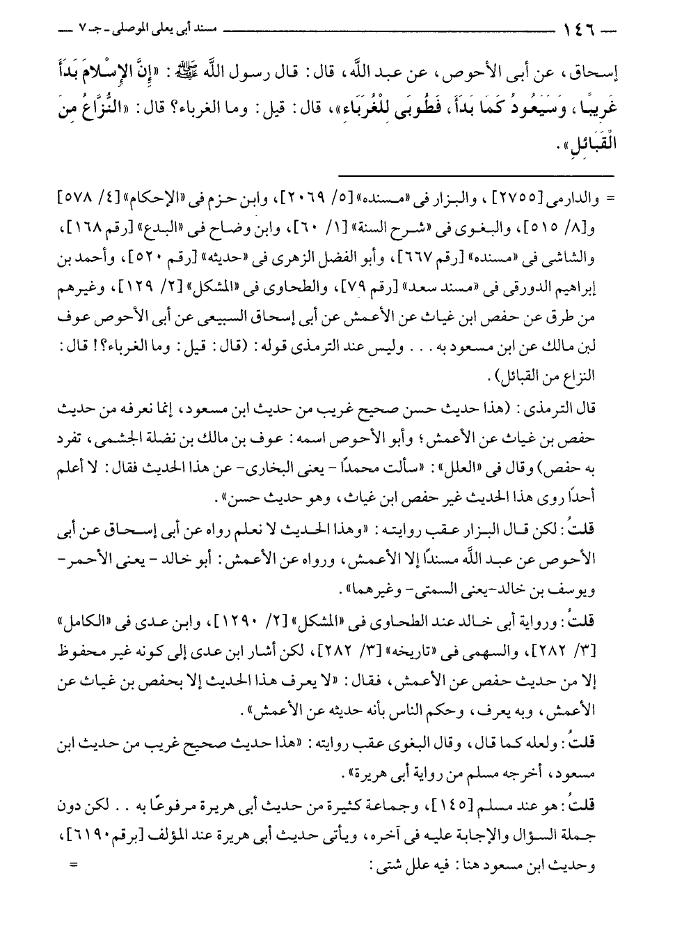 = والدارمى [٢٧٥٥]، والبزار في "مسنده" [٥/ ٢٠٦٩]، وابن حزم في "الإحكام" [٤/ ٥٧٨] و [٨/ ٥١٥]، والبغوى في "شرح السنة" [١/ ٦٠]، وابن وضاح في "البدع" [رقم ١٦٨]، والشاشى في "مسنده" [رقم ٦٦٧]، وأبو الفضل الزهرى في "حديثه" [رقم ٥٢٠]، وأحمد بن إبراهيم الدورقى في "مسند سعد" [رقم ٧٩]، والطحاوى في "المشكل" [٢/ ١٢٩]، وغيرهم من طرق عن حفص بن غياث عن الأعمش عن أبى إسحاق السبيعى عن أبى الأحوص عوف بن مالك عن ابن مسعود به ... وليس عند الترمذى قوله: (قال: قيل: وما الغرباء؟! قال: النزاع من القبائل).