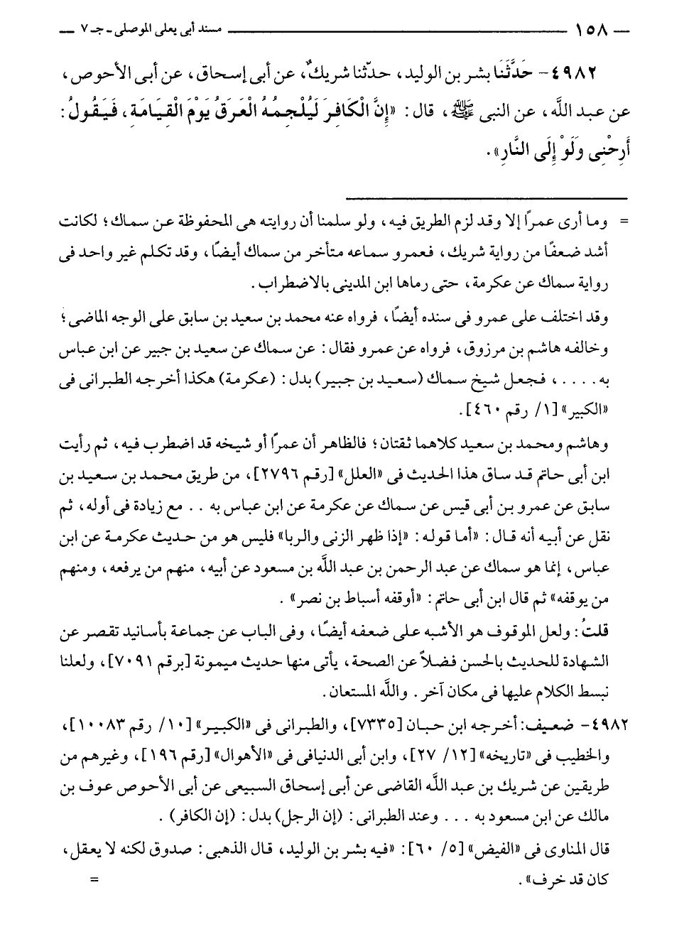 ٤٩٨٢ - حَدَّثَنَا بشر بن الوليد، حدَّثنا شريكٌ، عن أبى إسحاق، عن أبى الأحوص، عن عبد الله، عن النبي - صلى الله عليه وسلم -، قال: "إِنَّ الْكَافِرَ لَيلْجِمُهُ الْعَرَقُ يَوْمَ الْقِيَامَةِ، فَيَقولُ: أَرِحْنِى وَلَوْ إلَى النَّارِ".