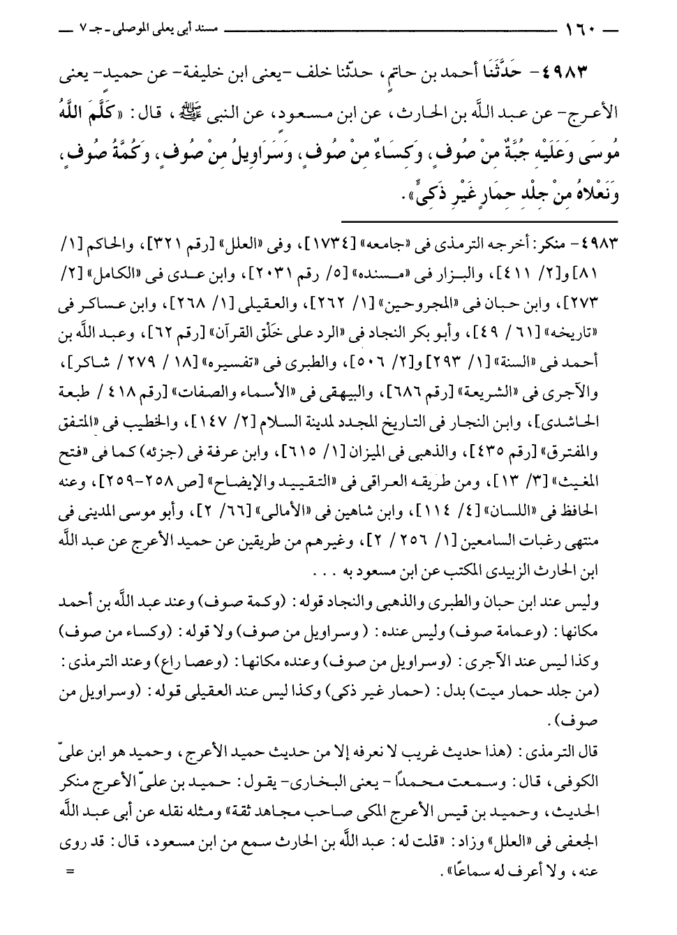 ٤٩٨٣ - منكر: أخرجه الترمذى في "جامعه" [١٧٣٤]، وفى "العلل" [رقم ٣٢١]، والحاكم [١/ ٨١] و [٢/ ٤١١]، والبزار في "مسنده" [٥/ رقم ٢٠٣١]، وابن عدى في "الكامل" [٢/ ٢٧٣]، وابن حبان في "المجروحين" [١/ ٢٦٢]، والعقيلى [١/ ٢٦٨]، وابن عساكر في "تاريخه" [٦١/ ٤٩]، وأبو بكر النجاد في "الرد على خَلْق القرآن" [رقم ٦٢]، وعبد الله بن أحمد في "السنة" [١/ ٢٩٣، و [٢/ ٥٠٦]، والطبرى في "تفسيره" [١٨/ ٢٧٩/ شاكر]، والآجرى في "الشريعة" [رقم ٦٨٦]، والبيهقى في "الأسماء والصفات" [رقم / ٤١٨ طبعة الحاشدى]، وابن النجار في التاريخ المجدد لمدينة السلام [٢/ ١٤٧]، والخطيب في "المتفق والمفترق" [رقم ٤٣٥]، والذهبى في الميزان [١/ ٦١٥]، وابن عرفة في (جزئه) كما في "فتح المغيث" [٣/ ١٣]، ومن طريقه العراقى في "التقييد والإيضاح" [ص ٢٥٨ - ٢٥٩]، وعنه الحافظ في "اللسان" [٤/ ١١٤]، وابن شاهين في "الأمالى" [٦٦/ ٢]، وأبو موسى المدينى في منتهى رغبات السامعين [١/ ٢٥٦/ ٢]، وغيرهم من طريقين عن حميد الأعرج عن عبد الله بن الحارث الزبيدى المكتب عن ابن مسعود به ...