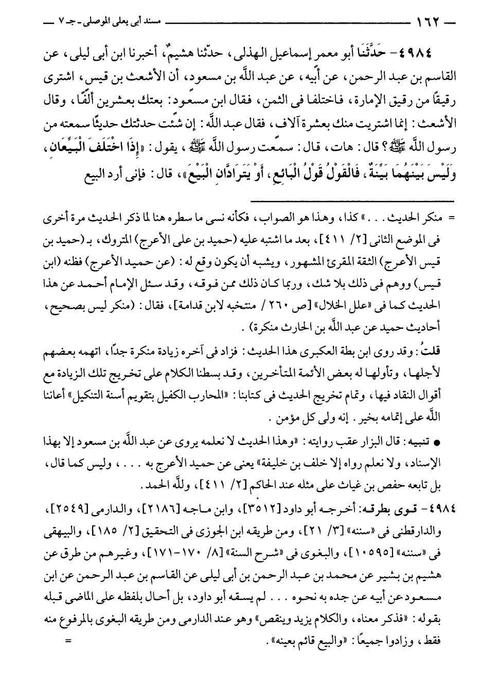 ٤٩٨٤ - قوى بطرقه: أخرجه أبو داود [٣٥١٢]، وابن ماجه [٢١٨٦]، والدارمى [٢٥٤٩]، والدارقطنى في "سننه" [٣/ ٢١]، ومن طريقه ابن الجوزى في التحقيق [٢/ ١٨٥]، والبيهقى في "سننه" [١٠٥٩٥]، والبغوى في "شرح السنة" [٨/ ١٧٠ - ١٧١]، وغيرهم من طرق عن هشيم بن بشير عن محمد بن عبد الرحمن بن أبى ليلى عن القاسم بن عبد الرحمن عن ابن مسعود عن أبيه عن جده به نحوه ... لم يسقه أبو داود، بل أحال بلفظه على الماضى قبله بقوله: "فذكر معناه، والكلام يزيد وينقص" وهو عند الدارمى ومن طريقه البغوى بالمرفوع منه فقط، وزادوا جميعًا: "والبيع قائم بعينه". =