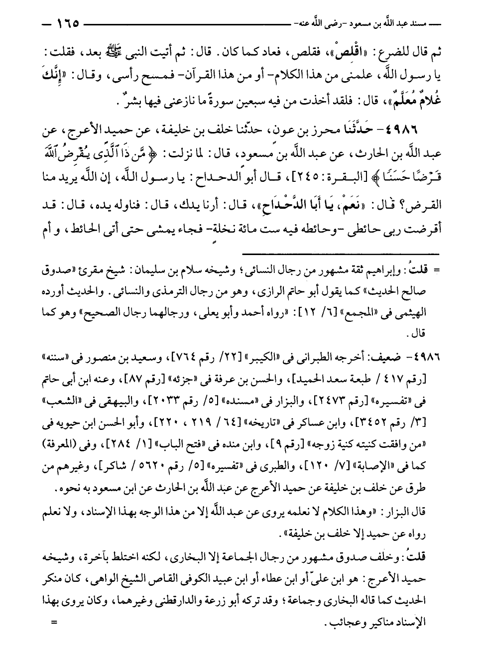 ٤٩٨٦ - ضعيف: أخرجه الطبراني في "الكبير" [٢٢/ رقم ٧٦٤]، وسعيد بن منصور في "سننه" [رقم ٤١٧/ طبعة سعد الحميد]، والحسن بن عرفة في "جزئه" [رقم ٨٧]، وعنه ابن أبى حاتم في "تفسيره" [رقم ٢٤٧٣]، والبزار في "مسنده" [٥/ رقم ٢٠٣٣]، والبيهقى في "الشعب" [٣/ رقم ٣٤٥٢]، وابن عساكر في "تاريخه" [٦٤/ ٢١٩، ٢٢٠]، وأبو الحسن بن حيويه في "من وافقت كنيته كنية زوجه" [رقم ٩]، وابن منده في "فتح الباب" [١/ ٢٨٤]، وفى (المعرفة) كما في "الإصابة" [٧/ ١٢٠]، والطبرى في "تفسيره" [٥/ رقم ٥٦٢٠/ شاكر]، وغيرهم من طرق عن خلف بن خليفة عن حميد الأعرج عن عبد الله بن الحارث عن ابن مسعود به نحوه.