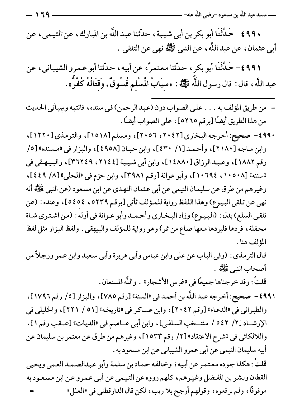 ٤٩٩٠ - صحيح: أخرجه البخارى [٢٠٤٢، ٢٠٥٦]، ومسلم [١٥١٨]، والترمذى [١٢٢٠]، وابن ماجه [٢١٨٠]، وأحمد [١/ ٤٣٠]، وابن حبان [٤٩٥٨]، والبزار في "مسنده" [٥/ رقم ١٨٨٢]، وعبد الرزاق [١٤٨٨٠]، وابن أبى شيبة [٢١٤٤، ٣٦٢٤٩]، والبيهقى في "سننه" [١٠٥٠٨، ١٠٦٩٤]، وأبو عوانة [رقم ٣٩٨١]، وابن حزم في "المحلى" [٨/ ٤٤٩]، وغيرهم من طرق عن سليمان التيمى عن أبى عثمان النهدى عن ابن مسعود (عن النبي - صلى الله عليه وسلم - أنه نهى عن تلقى البيوع) وهذا اللفظ رواية للمؤلف تأتى [برقم ٥٢٣٩، ٥٤٥٤] وعنده: (عن تلقى السلع) بدل: (البيوع) وزاد البخارى وأحمد وأبو عوانة في أوله: (من اشترى شاة محفلة، فردها فليردها معها صاع من تمر) وهو رواية للمؤلف والبيهقى. ولفظ البزار مثل لفظ المؤلف هنا.