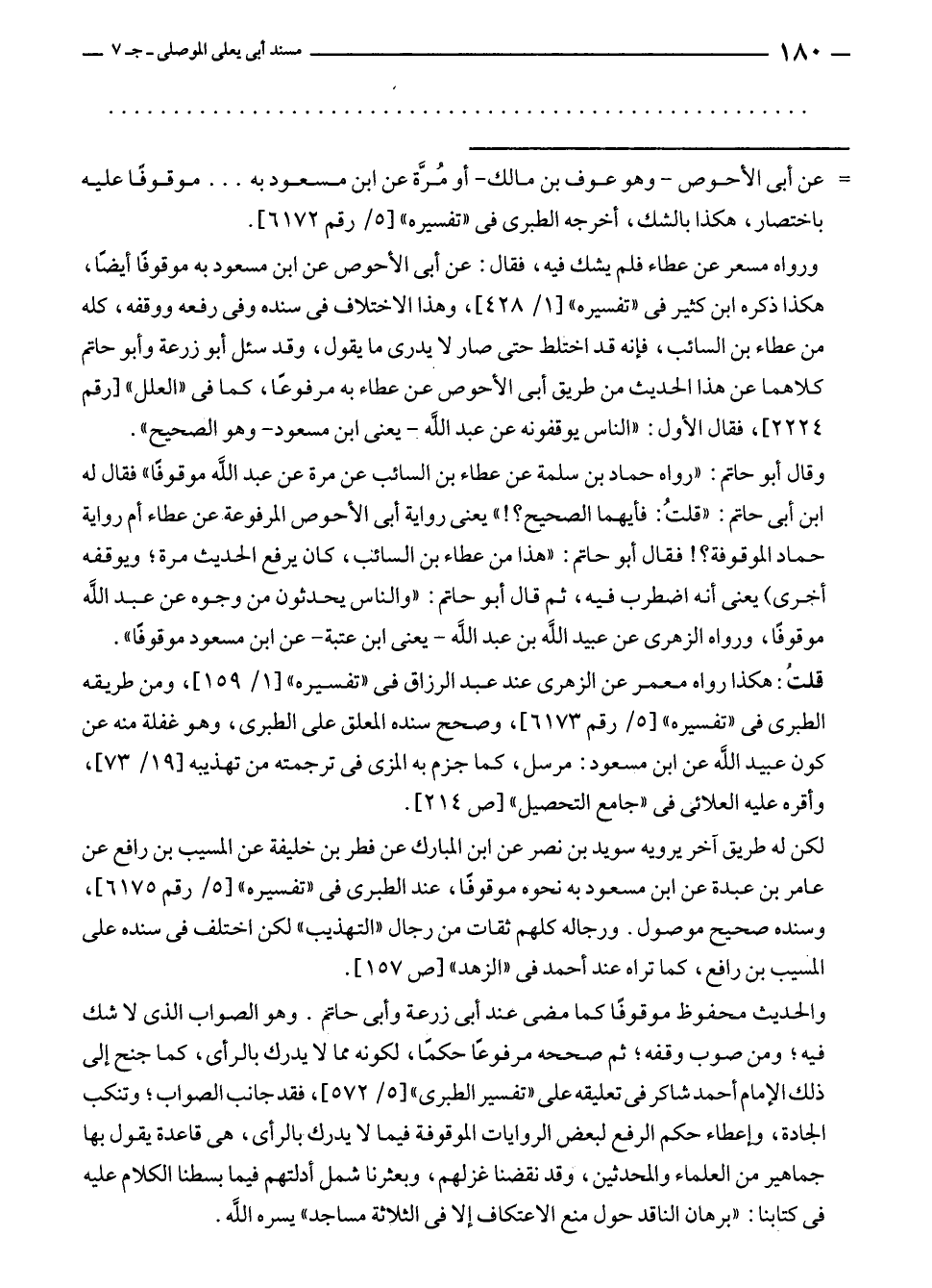 ورواه مسعر عن عطاء فلم يشك فيه، فقال: عن أبى الأحوص عن ابن مسعود به موقوفًا أيضًا، هكذا ذكره ابن كثير في "تفسيره" [١/ ٤٢٨]، وهذا الاختلاف في سنده وفى رفعه ووقفه، كله من عطاء بن السائب، فإنه قد اختلط حتى صار لا يدرى ما يقول، وقد سئل أبو زرعة وأبو حاتم كلاهما عن هذا الحديث من طريق أبى الأحوص عن عطاء به مرفوعًا، كما في "العلل" [رقم ٢٢٢٤]، فقال الأول: "الناس يوقفونه عن عبد الله - يعنى ابن مسعود - وهو الصحيح".