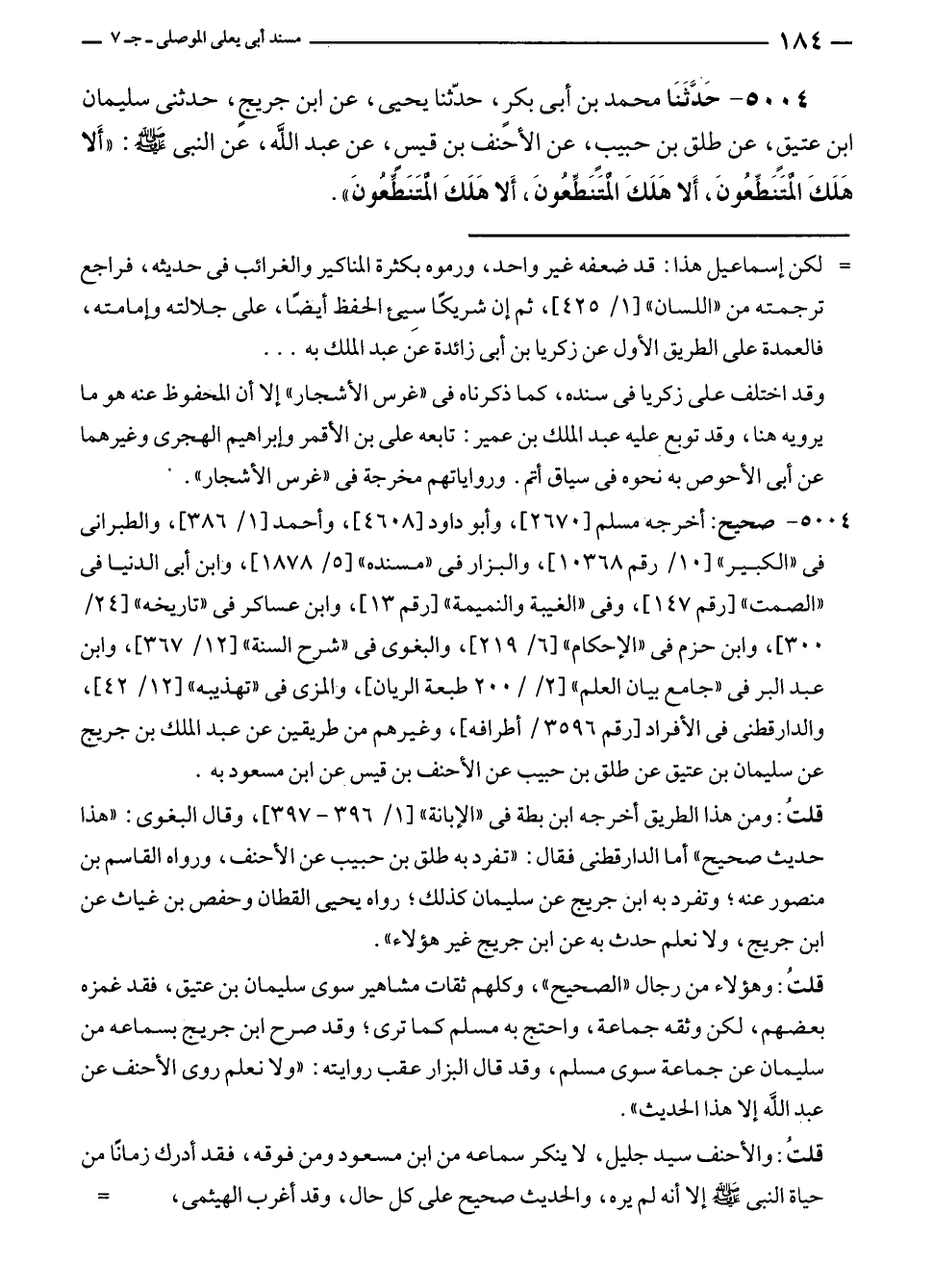 ٥٠٠٤ - حَدَّثَنَا محمد بن أبى بكرٍ، حدّثنا يحيى، عن ابن جريجٍ، حدثنى سليمان بن عتيقٍ، عن طلق بن حبيبٍ، عن الأحنف بن قيسٍ، عن عبد الله، عن النبي - صلى الله عليه وسلم -: "أَلا هَلَكَ المتَنَطِّعُونَ، أَلا هَلَكَ المتِنَطِّعونَ، أَلا هَلَكَ المَتَنَطِّعونَ".