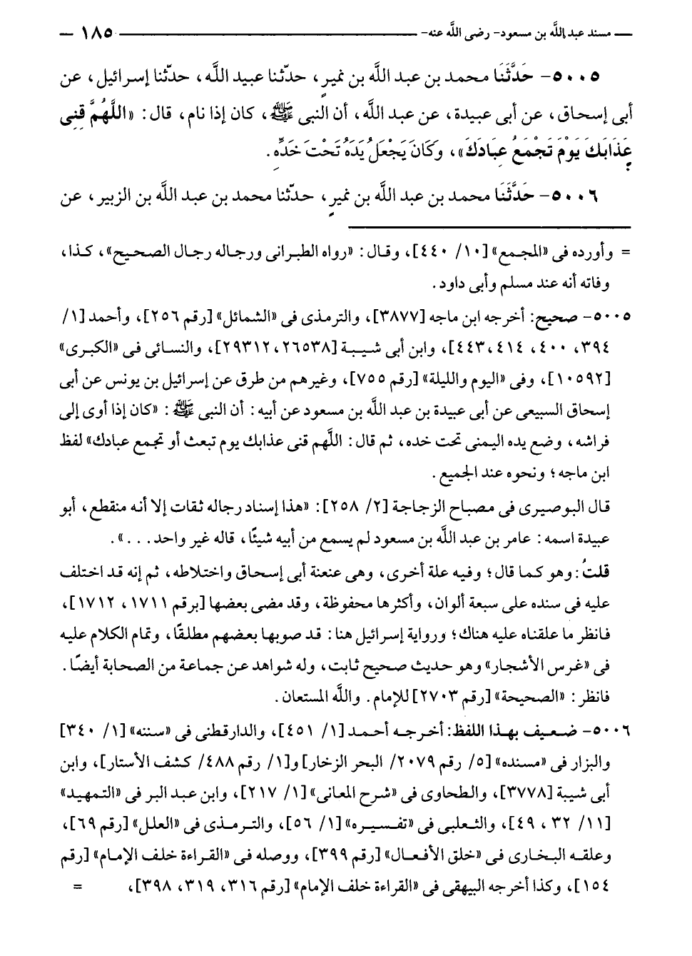 ٥٠٠٥ - حَدَّثَنَا محمد بن عبد الله بن نميرٍ، حدّثنا عبيد الله، حدّثنا إسرائيل، عن أبى إسحاق، عن أبى عبيدة، عن عبد الله، أن النبي - صلى الله عليه وسلم -، كان إذا نام، قال: "اللَّهُمَّ قِنِي عَذَابَكَ يَوْمَ تَجْمَعُ عِبَادَكَ"، وَكَانَ يَجْعَلُ يَدَهُ تَحْتَ خَدِّهِ.