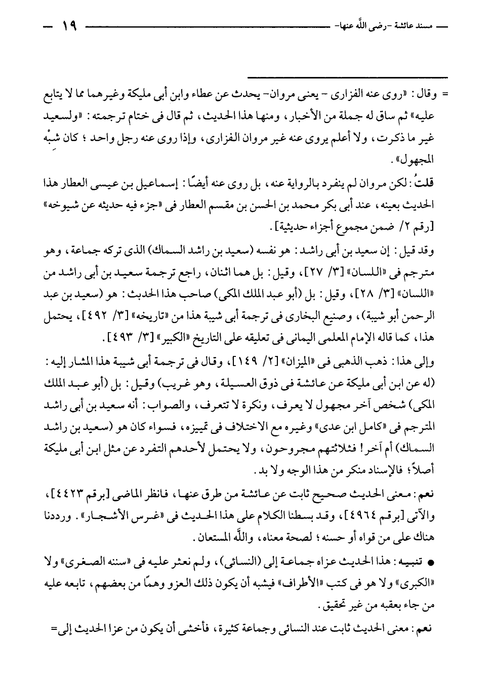 وإلى هذا: ذهب الذهبى في "الميزان" [٢/ ١٤٩]، وقال في ترجمة أبى شيبة هذا المشار إليه: (له عن ابن أبى مليكة عن عائشة في ذوق العسيلة، وهو غريب) وقيل: بل (أبو عبد الملك المكى) شخص آخر مجهول لا يعرف، ونكرة لا تتعرف، والصواب: أنه سعيد بن أبى راشد المترجم في "كامل ابن عدى" وغيره مع الاختلاف في تمييزه، فسواء كان هو (سعيد بن راشد السماك) أم آخر! فثلاثتهم مجروحون، ولا يحتمل لأحدهم التفرد عن مثل ابن أبى مليكة أصلًا؛ فالإسناد منكر من هذا الوجه ولا بد.