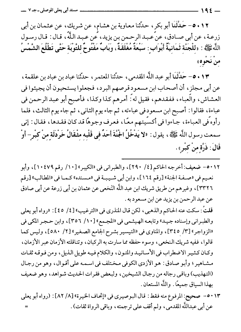 ٥٠١٢ - حَدَّثَنَا أبو بكر، حدّثنا معاوية بن هشامٍ، عن شريكٍ، عن عثمان بن أبى زرعة، عن أبى صادق، عن عبد الرحمن بن يزيد، عن عبد الله، قال: قال رسول الله - صلى الله عليه وسلم -: "لِلْجَنَّةِ ثَمَانِيَة أَبْوَابٍ: سَبْعَةٌ مُغْلَقَةٌ، وَبَابٌ مَفْتُوحٌ لِلتَّوْبَةِ حَتَّى تَطْلُعَ الشَّمْسُ مِنْ نَحْوِهِ".