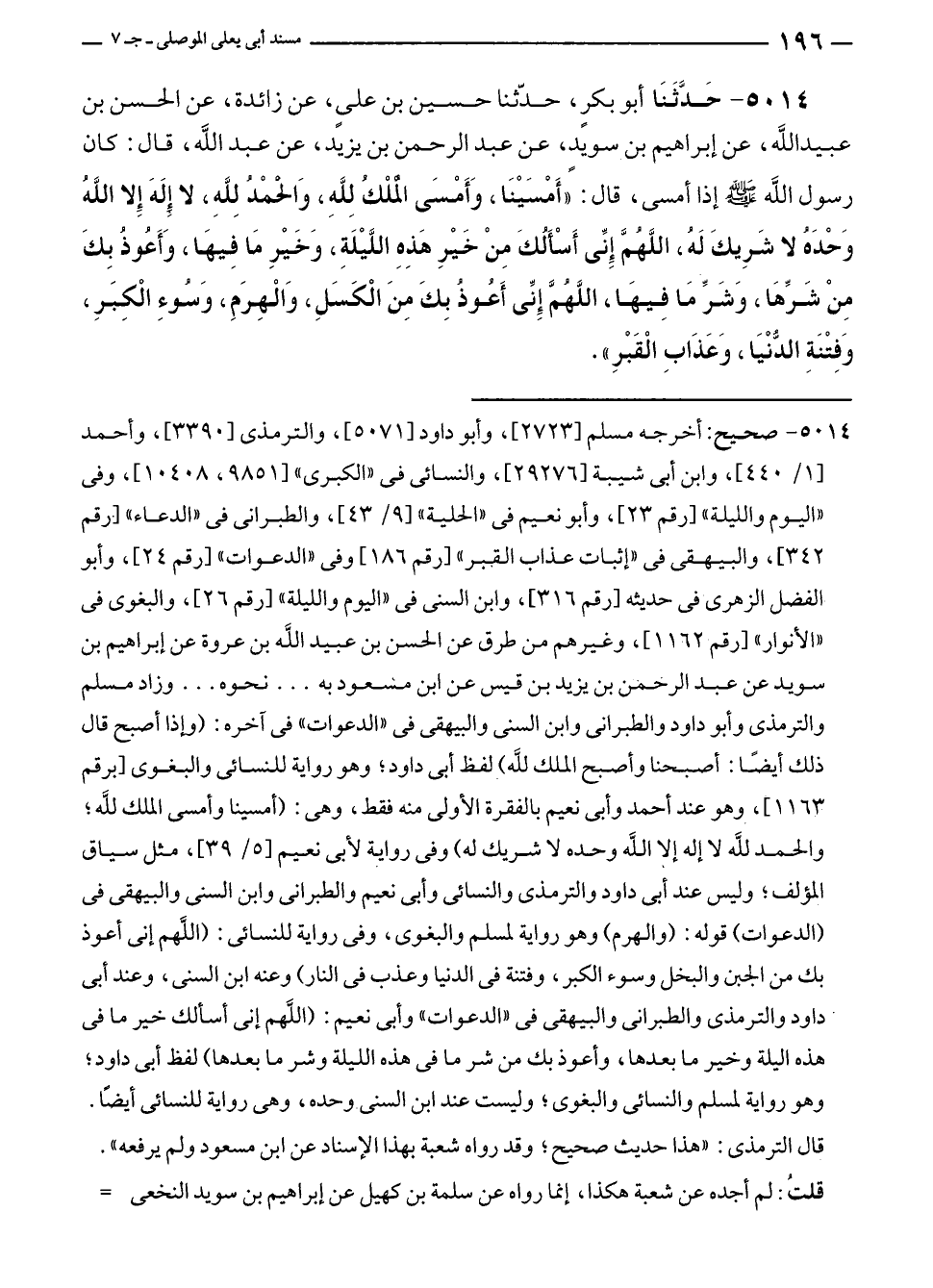 ٥٠١٤ - حَدَّثَنا أبو بكرٍ، حدّثنا حسين بن علي، عن زائدة، عن الحسن بن عبيد اللَّه، عن إبراهيم بن سويدٍ، عن عبد الرحمن بن يزيد، عن عبد الله، قال: كان رسول الله - صلى الله عليه وسلم - إذا أمسى، قال: "أَمْسَيْنَا، وَأَمْسَى المُلْكُ لِلَّهِ، وَالحمْدُ لِلَّهِ، لا إِلَهَ إِلا اللَّهُ وَحْدَهُ لا شَرِيكَ لَهُ، اللَّهُمَّ إِنَّى أَسْأَلُكَ مِنْ خَيْرِ هَذِهِ اللَّيْلَةِ، وَخَيْرِ مَا فِيهَا، وَأَعُوذُ بِكَ مِنْ شَرِّهَا، وَشَرِّ مَا فِيهَا، اللَّهمَّ إِنَّى أَعُوذُ بِكَ مِنَ الْكَسَلِ، وَالْهِرَمِ، وَسُوءِ الْكِبَرِ، وَفِتْنَةِ الدُّنْيَا، وَعَذَابِ الْقَبْرِ".