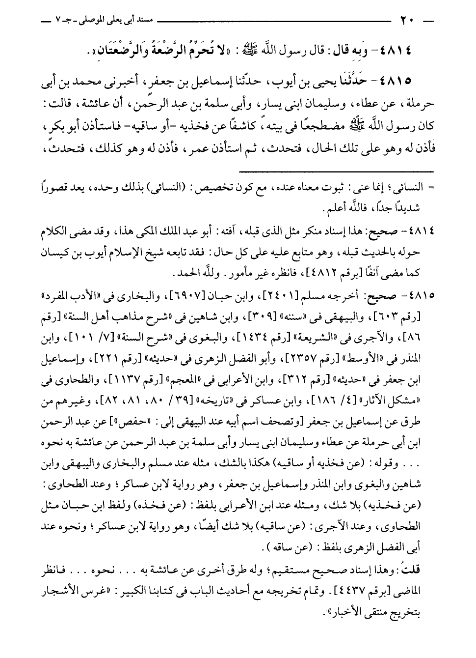 ٤٨١٥ - صحيح: أخرجه مسلم [٢٤٠١]، وابن حبان [٦٩٠٧]، والبخارى في "الأدب المفرد" [رقم ٦٠٣]، والبيهقى في "سننه" [٣٠٩]، وابن شاهين في "شرح مذاهب أهل السنة" [رقم ٨٦]، والآجرى في "الشريعة" [رقم ١٤٣٤]، والبغوى في "شرح السنة" [٧/ ١٠١]، وابن المنذر في "الأوسط" [رقم ٢٣٥٧]، وأبو الفضل الزهرى في "حديثه" [رقم ٢٢١]، وإسماعيل بن جعفر في "حديثه" [رقم ٣١٢]، وابن الأعرابى في "المعجم" [رقم ١١٣٧]، والطحاوى في "مشكل الآثار" [٤/ ١٨٦]، وابن عساكر في "تاريخه" [٣٩/ ٨٠، ٨١، ٨٢]، وغيرهم من طرق عن إسماعيل بن جعفر [وتصحف اسم أبيه عند البيهقى إلى: "حفص"] عن عبد الرحمن بن أبى حرملة عن عطاء وسليمان ابنى يسار وأبى سلمة بن عبد الرحمن عن عائشة به نحوه ... وقوله: (عن فخذيه أو ساقيه) هكذا بالشك، مثله عند مسلم والبخارى والبيهقي وابن شاهين والبغوى وابن المنذر وإسماعيل بن جعفر، وهو رواية لابن عساكر؛ وعند الطحاوى: (عن فخذيه) بلا شك، ومثله عند ابن الأعرابى بلفظ: (عن فخذه) ولفظ ابن حبان مثل الطحاوى، وعند الآجرى: (عن ساقيه) بلا شك أيضًا، وهو رواية لابن عساكر؛ ونحوه عند أبى الفضل الزهرى بلفظ: (عن ساقه).