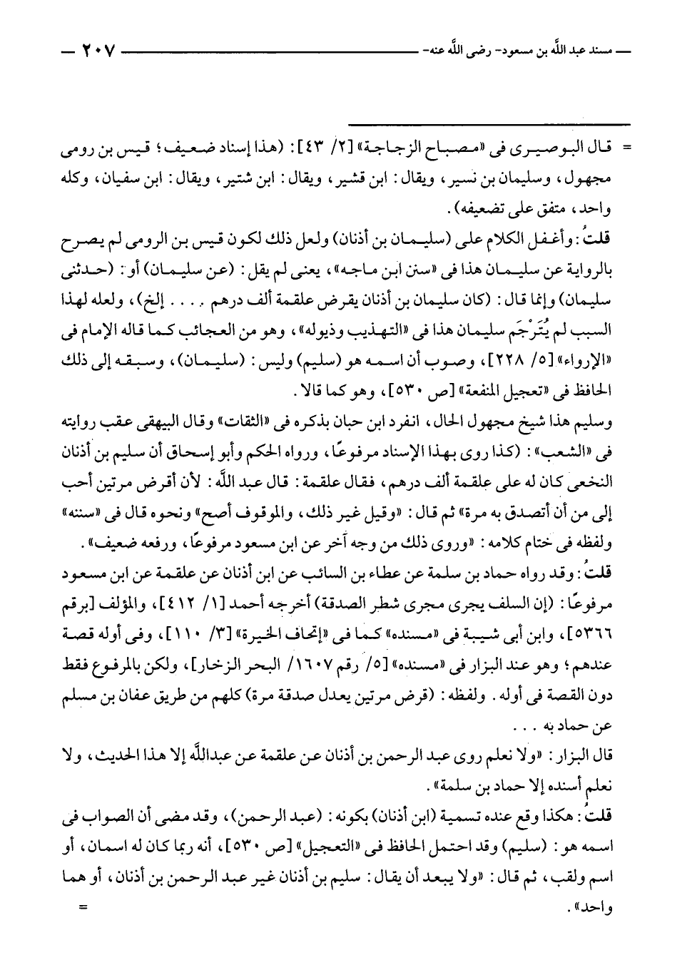 قلتُ: وأغفل الكلام على (سليمان بن أذنان) ولعل ذلك لكون قيس بن الرومى لم يصرح بالرواية عن سليمان هذا في "سنن ابن ماجه"، يعنى لم يقل: (عن سليمان) أو: (حدثنى سليمان) وإنما قال: (كان سليمان بن أذنان يقرض علقمة ألف درهم ..... إلخ)، ولعله لهذا السبب لم يُتَرْجَم سليمان هذا في "التهذيب وذيوله"، وهو من العجائب كما قاله الإمام في "الإرواء" [٥/ ٢٢٨]، وصوب أن اسمه هو (سليم) وليس: (سليمان)، وسبقه إلى ذلك الحافظ في "تعجيل المنفعة" [ص ٥٣٠]، وهو كما قالا.