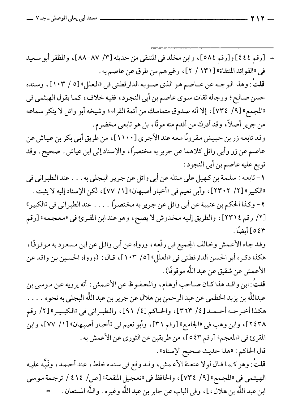 قلتُ: وهذا الوجه عن عاصم هو الذي صوبه الدارقطنى في "العلل" [٥/ ١٠٣]، وسنده حسن صالح، ورجاله ثقات سوى عاصم بن أبى النجود، ففيه خلاف، كما يقول الهيثمى في "المجمع" [٩/ ٧٣٤]، إلا أنه صدوق متماسك من أئمة القراء؛ وشيخه أبو وائل لا ينكر سماعه من جرير أصلًا، وقد أدرك من أقدم منه موتًا، بل هو تابعى مخضرم.