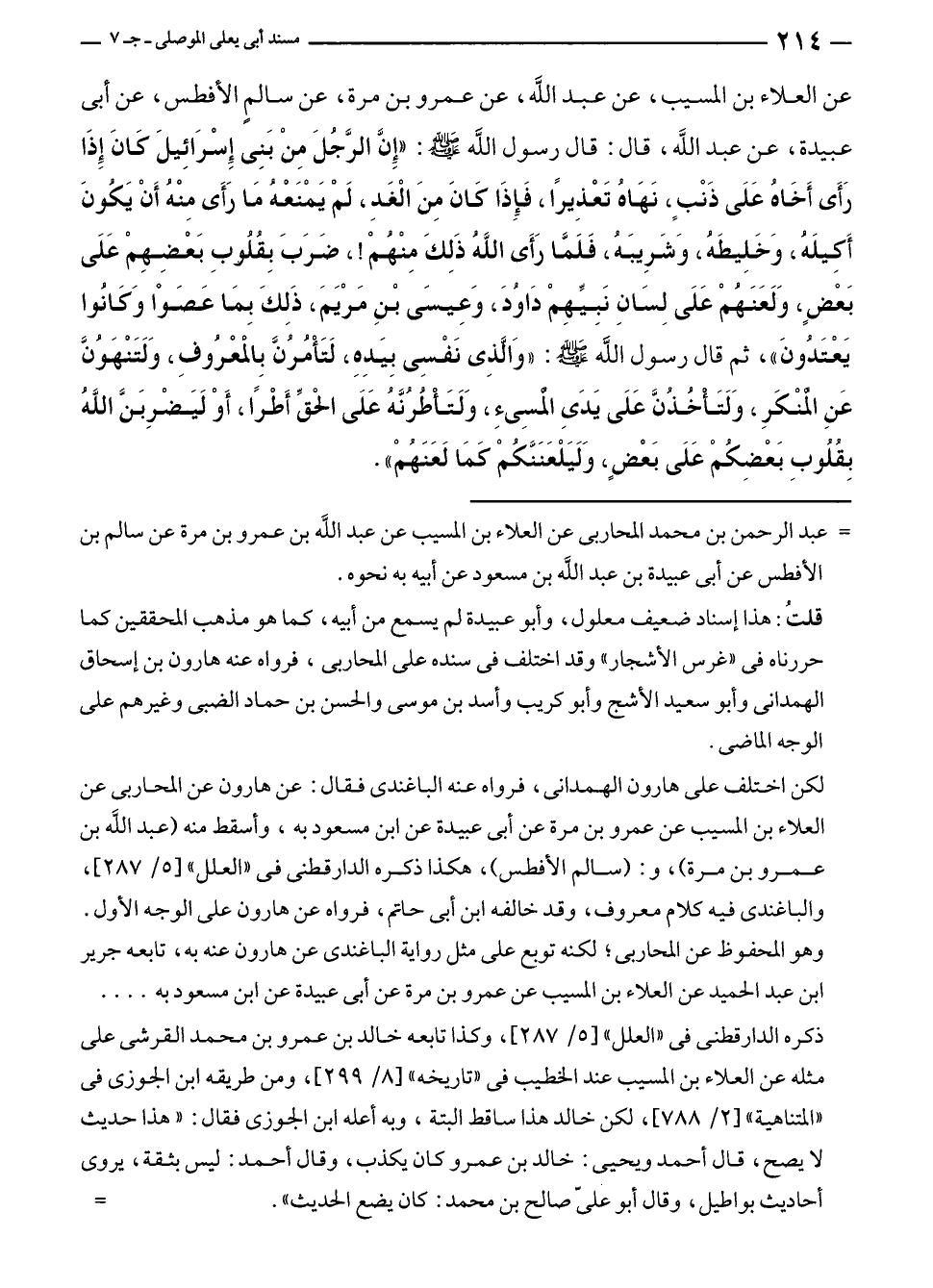 عن العلاء بن المسيب، عن عبد الله، عن عمرو بن مرة، عن سالمٍ الأفطس، عن أبى عبيدة، عن عبد الله، قال: قال رسول الله - صلى الله عليه وسلم -: "إِنَّ الرَّجُلَ مِنْ بَنِي إِسْرَائِيلَ كَانَ إِذَا رَأَى أَخَاهُ عَلَى ذَنْبٍ، نَهَاهُ تَعْذِيرًا، فَإِذَا كَانَ مِنَ الْغَدِ، لَمْ يَمْنَعْهُ مَا رَأَى مِنْهُ أَنْ يَكُونَ أَكِيلَهُ، وَخَلِيطَهُ، وَشَرِيبَهُ، فَلَمَّا رَأَى اللَّهُ ذَلِكَ مِنْهُمْ!، ضَرَبَ بِقُلُوبِ بَعْضِهِمْ عَلَى بَعْضٍ، وَلَعَنَهُمْ عَلَى لِسَانِ نَبِيِّهِمْ دَاوُدَ، وَعِيسَى بْنِ مَرْيَمَ، ذَلِكَ بِمَا عَصَوْا وَكَانُوا يَعْتَدُونَ"، ثم قال رسول الله - صلى الله عليه وسلم -: "وَالَّذِى نَفْسِى بِيَدِهِ، لَتَأْمُرُنَّ بِالمعْرُوفِ، وَلَتَنْهَوُنَّ عَنِ المُنْكَرِ، وَلَتَأْخُذُنَّ عَلَى يَدَى المُسِئِ، وَلَتَأْطُرُنَّهُ عَلَى الحقِّ أَطْرًا، أَوْ لَيَضْرِ بَنَّ اللَّهُ بِقُلُوبِ بَعْضِكُمْ عَلَى بَعْضٍ، وَلَيَلْعَنَنَّكُمْ كَمَا لَعَنَهُمْ".