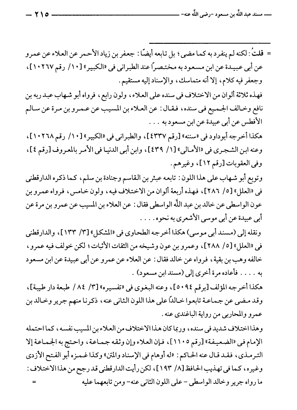 فهذه ثلاثة ألوان من الاختلاف في سنده على العلاء، ولون رابع، فرواه أبو شهاب عبد ربه بن نافع وخالف الجميع في سنده، فقال: عن العلاء بن المسيب عن عمرو بن مرة عن سالم الأفطس عن أبى عبيدة عن ابن مسعود به ...