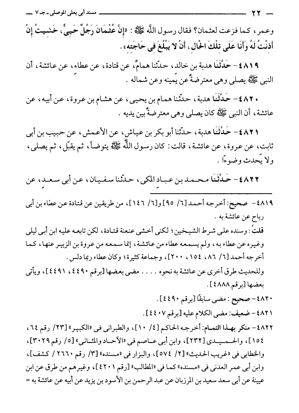 ٤٨١٩ - حَدَّثَنَا هدبة بن خالدٍ، حدّثنا همامٌ، عن قتادة، عن عطاءٍ، عن عائشة، أن النبي - صلى الله عليه وسلم - يصلى وهى معترضةٌ عن يمينه وعن شماله.