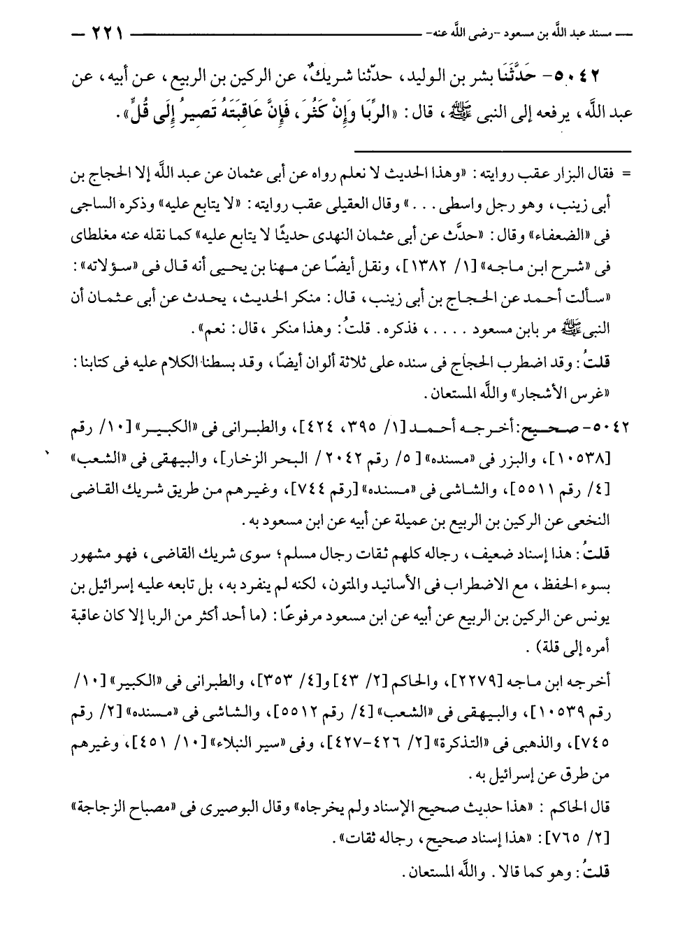 قلتُ: هذا إسناد ضعيف، رجاله كلهم ثقات رجال مسلم؛ سوى شريك القاضى، فهو مشهور بسوء الحفظ، مع الاضطراب في الأسانيد والمتون، لكنه لم ينفرد به، بل تابعه عليه إسرائيل بن يونس عن الركين بن الربيع عن أبيه عن ابن مسعود مرفوعًا: (ما أحد أكثر من الربا إلا كان عاقبة أمره إلى قلة).