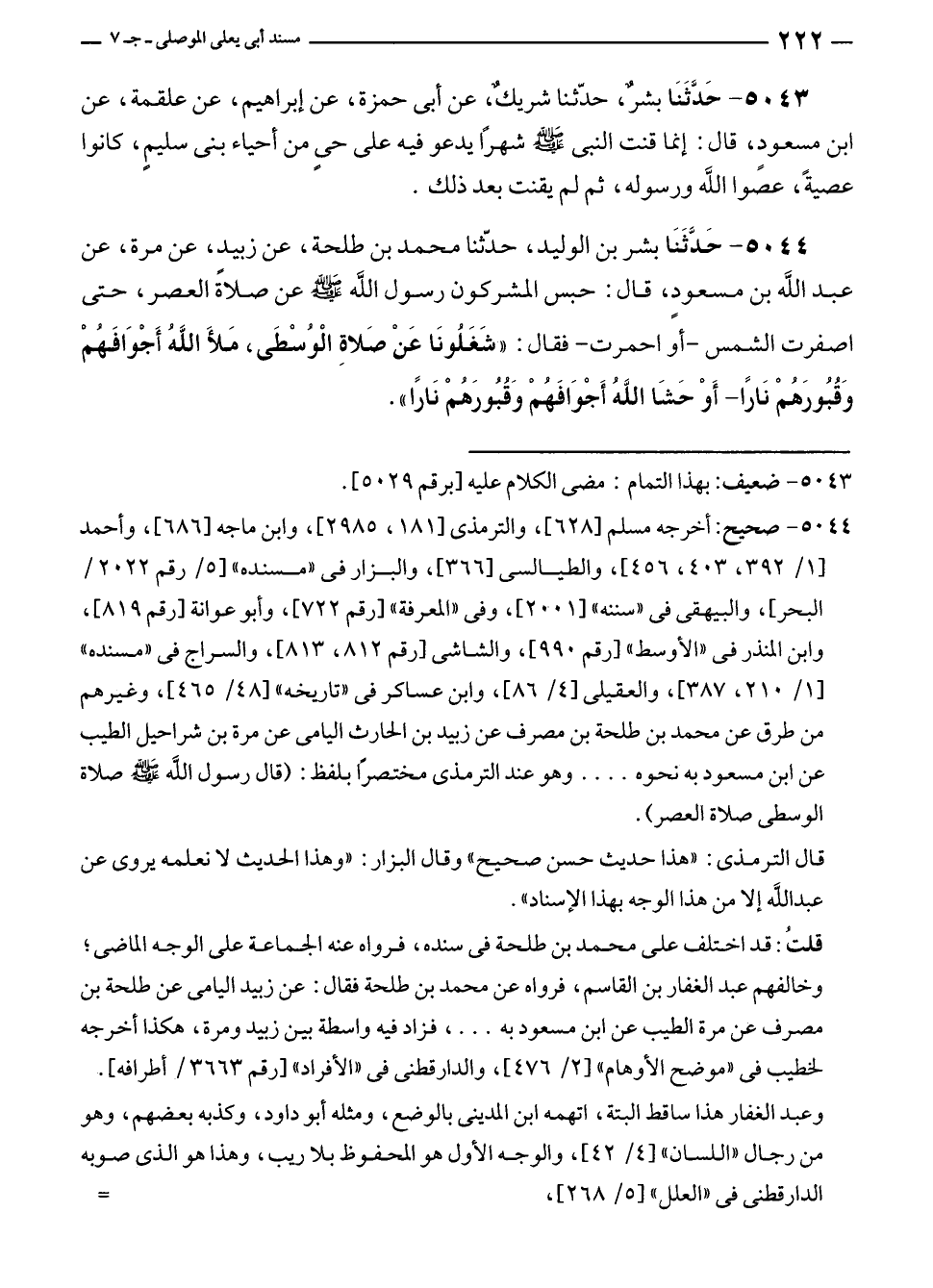 ٥٠٤٤ - صحيح: أخرجه مسلم [٦٢٨]، والترمذى [١٨١، ٢٩٨٥]، وابن ماجه [٦٨٦]، وأحمد [١/ ٣٩٢، ٤٠٣، ٤٥٦]، والطيالسى [٣٦٦]، والبزار في "مسنده" [٥/ رقم ٢٠٢٢/ البحر]، والبيهقى في "سننه" [٢٠٠١]، وفى "المعرفة" [رقم ٧٢٢]، وأبو عوانة [رقم ٨١٩]، وابن المنذر في "الأوسط" [رقم ٩٩٠]، والشاشى [رقم ٨١٢، ٨١٣]، والسراج في "مسنده" [١/ ٢١٠، ٣٨٧]، والعقيلى [٤/ ٨٦]، وابن عساكر في "تاريخه" [٤٨/ ٤٦٥]، وغيرهم من طرق عن محمد بن طلحة بن مصرف عن زبيد بن الحارث اليامى عن مرة بن شراحيل الطيب عن ابن مسعود به نحوه .... وهو عند الترمذى مختصرًا بلفظ: (قال رسول الله - صلى الله عليه وسلم - صلاة الوسطى صلاة العصر).
