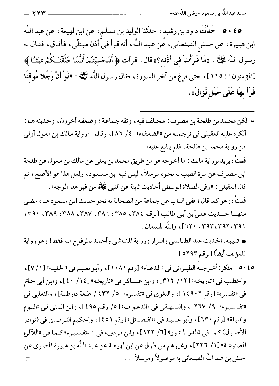 ٥٠٤٥ - حَدَّثَنَا داود بن رشيدٍ، حدّثنا الوليد بن مسلمٍ، عن ابن لهيعة، عن عبد الله بن هبيرة، عن حنشٍ الصنعانى، عن عبد الله، أنه قرأ في أذن مبتلًى، فأفاق، فقال له رسول الله - صلى الله عليه وسلم -: "مَا قَرَأْتَ فِي أُذُنِهِ؟ " قال: قرأت {أَفَحَسِبْتُمْ أَنَّمَا خَلَقْنَاكُمْ عَبَثًا} [المؤمنون: ١١٥]، حتى فرغ من آخر السورة، فقال رسول الله - صلى الله عليه وسلم -: "لَوْ أَنَّ رَجُلا مُوقِنًا قَرَأَ بِهَا عَلَى جَبَلٍ لَزَالَ".
