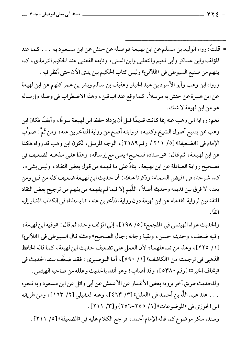نعم: رواية ابن وهب عنه إنما كانت قديمًا قبل أن يزداد حفظ ابن لهيعة سوءًا، وأيضًا فكان ابن وهب ممن يتتبع أصول الشيخ وكتبه، فروايته أصح من رواية المتأخرين عنه، ومن ثَمَّ: صوَّب الإمام في "الضعيفة" [٥/ ٢١١/ رقم ٢١٨٩]، الوجه المرسل، لكون ابن وهب قد رواه هكذا عن ابن لهيعة، ثم قال: "وإسناده صحيح" يعنى مع إرساله، وهذا على مذهبه الضعيف في تصحيح رواية العبادلة عن ابن لهيعة، بناءً على ما فهمه من قول بعض النقاد، وليس بشئ، كما شرحناه في "فيض السماء" وذكرنا هناك: أن حديث ابن لهيعة ضعيف كله من قبل ومن بعد، لا فرق بين قديمه وحديثه أصلًا، اللَّهم إلا فيما لم يفهمه من يفهم من ترجيح بعض النقاد المتقدمين لرواية القدماء عن ابن لهيعة دون رواية المتأخرين عنه، مما بسطناه في الكتاب المشار إليه آنفًا.