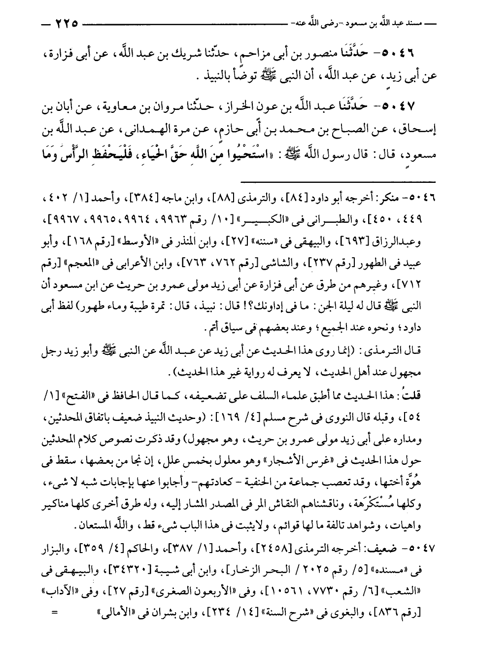 قال الترمذى: (إنما روى هذا الحديث عن أبى زيد عن عبد الله عن النبي - صلى الله عليه وسلم - وأبو زيد رجل مجهول عند أهل الحديث، لا يعرف له رواية غير هذا الحديث).