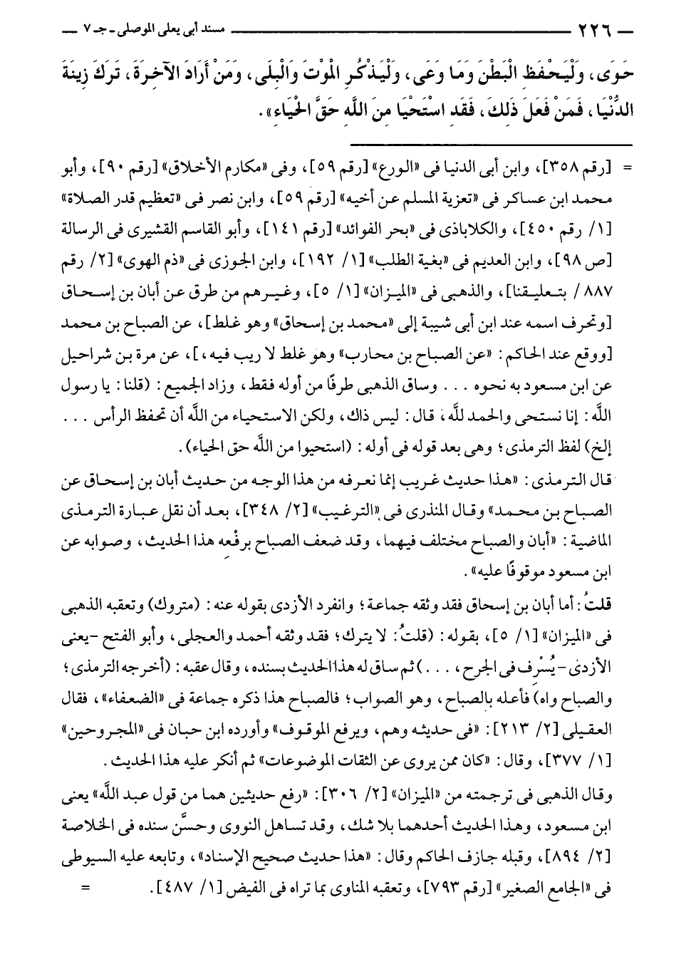 = [رقم ٣٥٨]، وابن أبى الدنيا في "الورع" [رقم ٥٩]، وفى "مكارم الأخلاق" [رقم ٩٠]، وأبو محمد بن عساكر في "تعزية المسلم عن أخيه" [رقم ٥٩]، وابن نصر في "تعظيم قدر الصلاة" [١/ رقم ٤٥٠]، والكلاباذى في "بحر الفوائد" [رقم ١٤١]، وأبو القاسم القشيرى في الرسالة [ص ٩٨]، وابن العديم في "بغية الطلب" [١/ ١٩٢]، وابن الجوزى في "ذم الهوى" [٢/ رقم ٨٨٧/ بتعليقنا]، والذهبى في "الميزان" [١/ ٥]، وغيرهم من طرق عن أبان بن إسحاق [وتحرف اسمه عند ابن أبى شيبة إلى "محمد بن إسحاق" وهو غلط]، عن الصباح بن محمد [ووقع عند الحاكم: "عن الصباح بن محارب" وهو غلط لا ريب فيه،]، عن مرة بن شراحيل عن ابن مسعود به نحوه ... وساق الذهبى طرفًا من أوله فقط، وزاد الجميع: (قلنا: يا رسول الله: إنا نستحى والحمد للَّه، قال: ليس ذاك، ولكن الاستحياء من الله أن تحفظ الرأس ... إلخ) لفظ الترمذى؛ وهى بعد قوله في أوله: (استحيوا من الله حق الحياء).