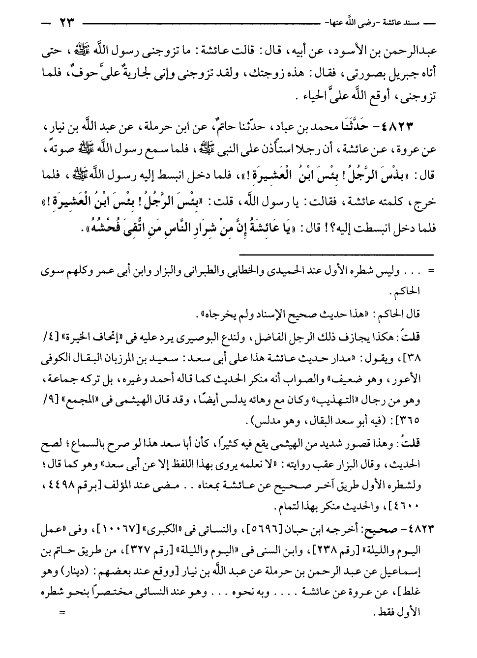 ٤٨٢٣ - صحيح: أخرجه ابن حبان [٥٦٩٦]، والنسائى في "الكبرى" [١٠٠٦٧]، وفى "عمل اليوم والليلة" [رقم ٢٣٨]، وابن السنى في "اليوم والليلة" [رقم ٣٢٧]، من طريق حاتم بن إسماعيل عن عبد الرحمن بن حرملة عن عبد الله بن نيار [ووقع عند بعضهم: (دينار) وهو غلط]، عن عروة عن عائشة .... وبه نحوه ... وهو عند النسائي مختصرًا بنحو شطره الأول فقط. =