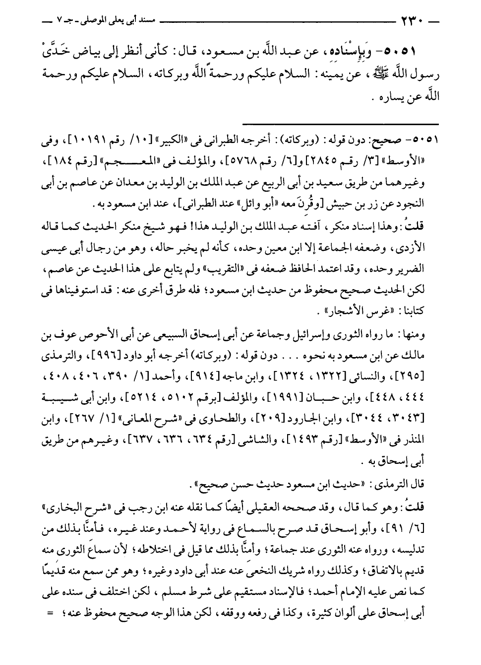 ٥٠٥١ - وَبِإِسْنَادِهِ، عن عبد الله بن مسعودٍ، قال: كأنى أنظر إلى بياض خَدَّىْ رسول الله - صلى الله عليه وسلم -، عن يمينه: السلام عليكم ورحمة الله وبركاته، السلام عليكم ورحمة الله عن يساره.