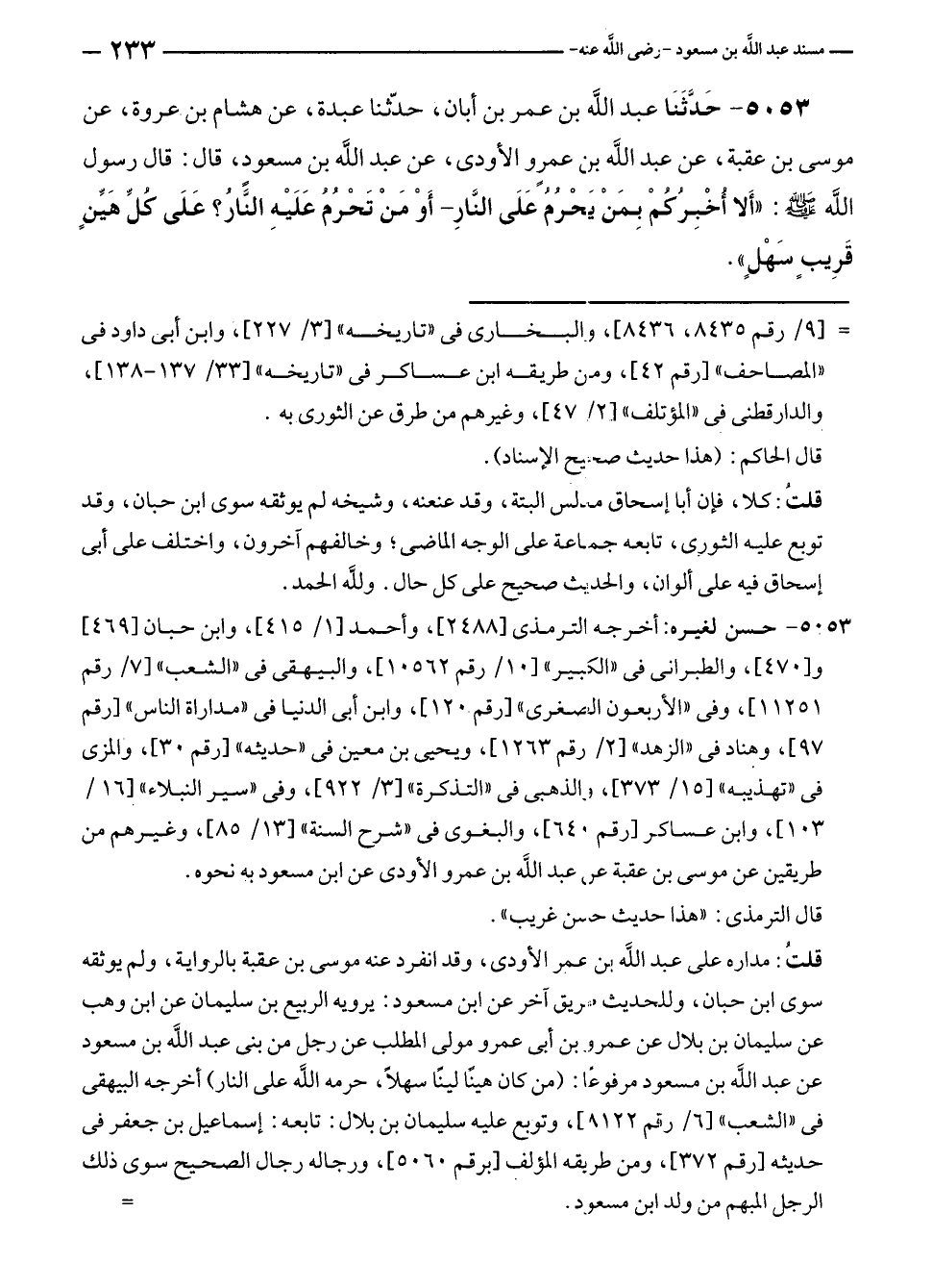 ٥٠٥٣ - حَدَّثَنَا عبد الله بن عمر بن أبان، حدّثنا عبدة، عن هشام بن عروة، عن موسى بن عقبة، عن عبد الله بن عمرٍو الأودى، عن عبد الله بن مسعود، قال: قال رسول الله - صلى الله عليه وسلم -: "أَلا أُخْبِركُمْ بِمَنْ يُحْرُمُ عَلَى النَّارِ أَوْ مَنْ تَحْرُمُ عَلَيْهِ النَّارُ؟ عَلَى كُلِّ هَيِّنٍ قَرِيبٍ سَهْلٍ".