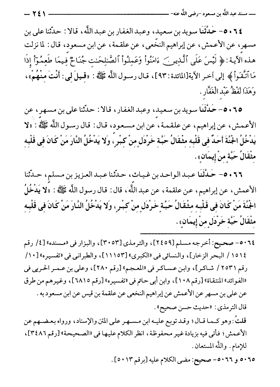 ٥٠٦٦ - حَدَّثَنَا عبد الواحد بن غياث، حدّثنا عبد العزيز بن مسلمٍ، حدّثنا الأعمش، عن إبراهيم، عن علقمة، عن عبد الله، قال: قال رسول الله - صلى الله عليه وسلم -: "لا يَدْخُلُ الجَنَّةَ مَنْ كَانَ فِي قَلْبِهِ مِثْقَالُ حَبَّةٍ خَرْدَلٍ مِنْ كِبْرٍ، وَلا يَدْخُلُ النَّارَ مَنْ كَانَ فِي قَلْبِهِ مِثْقَالُ حَبَّةِ خَرْدَلٍ مِنْ إِيمَانٍ".