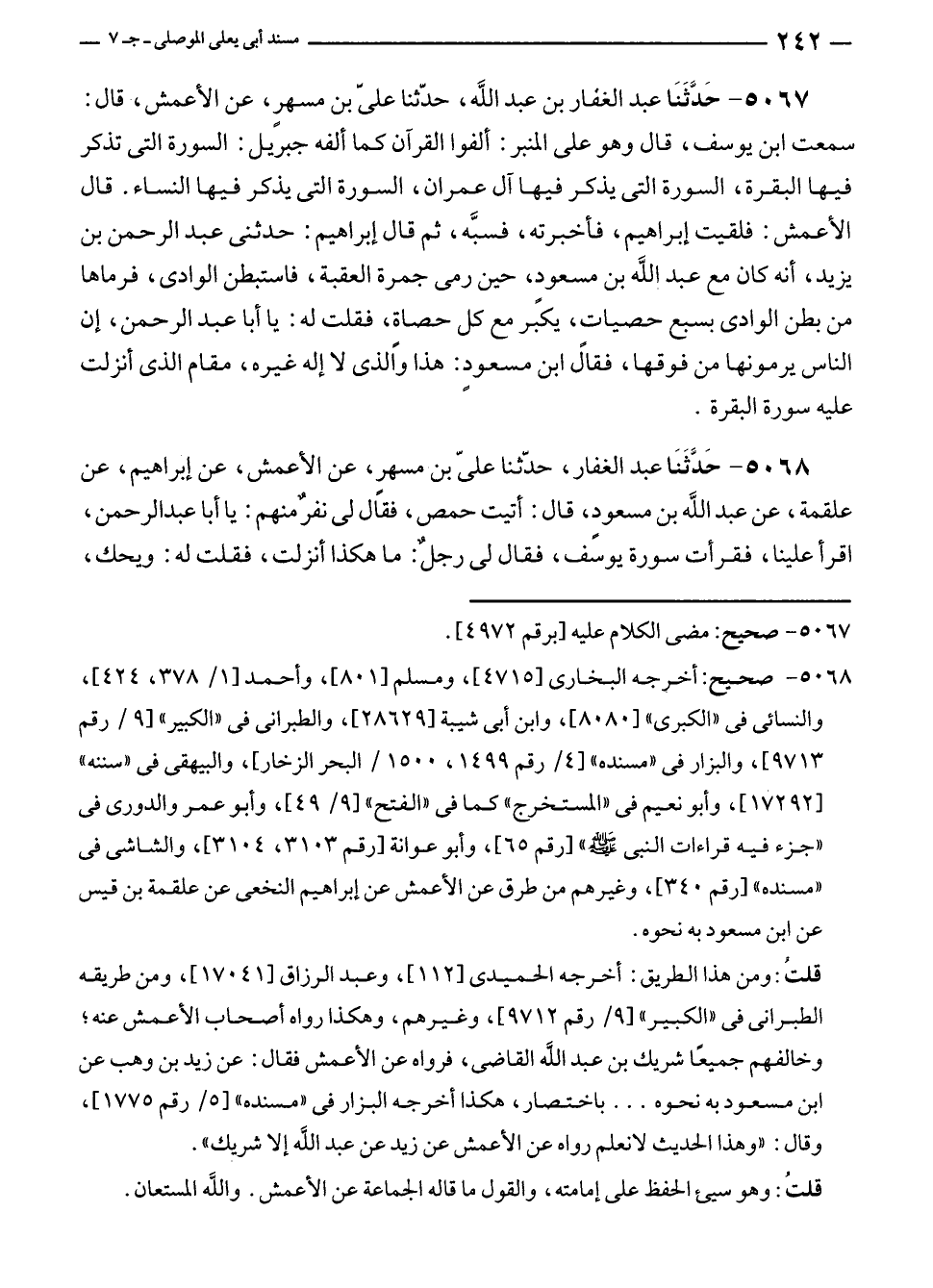 ٥٠٦٨ - صحيح: أخرجه البخاري [١٤٧١٥] ومسلم [٨٠١]، وأحمد [١/ ٣٧٨، ٤٢٤]، والنسائي في "الكبرى" [٨٠٨٠]، وابن أبي شيبة [٢٨٦٢٩]، والطبراني في "الكبير" [٩/ رقم ٩٧١٣]، والبزار في "مسنده" [٤/ رقم ١٤٩٩، / ١٥٠٠ البحر الزخار]، والبيهقي في "سننه" [١٧٢٩٢]، وأبو نعيم في "المستخرج " كما في "الفتح" [٩/ ٤٩]، وأبو عمر والدورى في "جزء فيه قراءات النبي - صلى الله عليه وسلم -" [رقم ٦٥]، وأبو عوانة [رقم ٣١٠٣، ٣١٠٤]،والشاشى في "مسنده" [رقم ٣٤٠]، وغيرهم من طرق عن الأعمش عن إبراهيم النخعي عن علقمة بن قيس عن ابن مسعودٍ به نحوه.