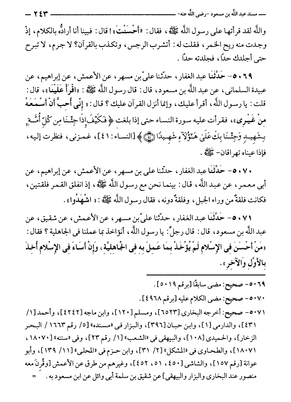 ٥٠٧١ - حَدَّثَنا عبد الغفار، حدّثنا عليّ بن مسهر، عن الأعمش، عن شقيق، عن عبد الله بن مسعود، قال: قال رجلٌ: يا رسول الله، أنؤاخذ بما عملنا في الجاهلية؟ فقال: "مَنْ أَحْسَنَ فِي الإِسلامِ لَمْ يُؤْخَذْ بِمَا عَمِلَ بِهِ فِي الجاهِلِيَّةِ، وَانْ أَسَاءَ فِي الإِسلامِ أُخِذَ بِالأَوَّلِ وَالآخِرِ".