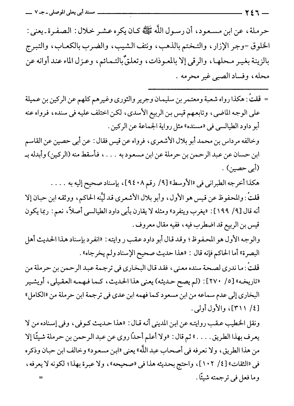 حرملة، عن ابن مسعود، أن رسول الله - صلى الله عليه وسلم - كان يكره عشر خلال: الصفرة - يعنى: الخلوق - وجر الإزار، والتختم بالذهب، ونتف الشيب، والضرب بالكعاب، والتبرج بالزينة بغير محلها، والرقى إلا بالمعوذات، وتعلقٌ بالتمائم، وعزل الماء عند أوانه عن محله، وفساد الصبى غير محرمه.