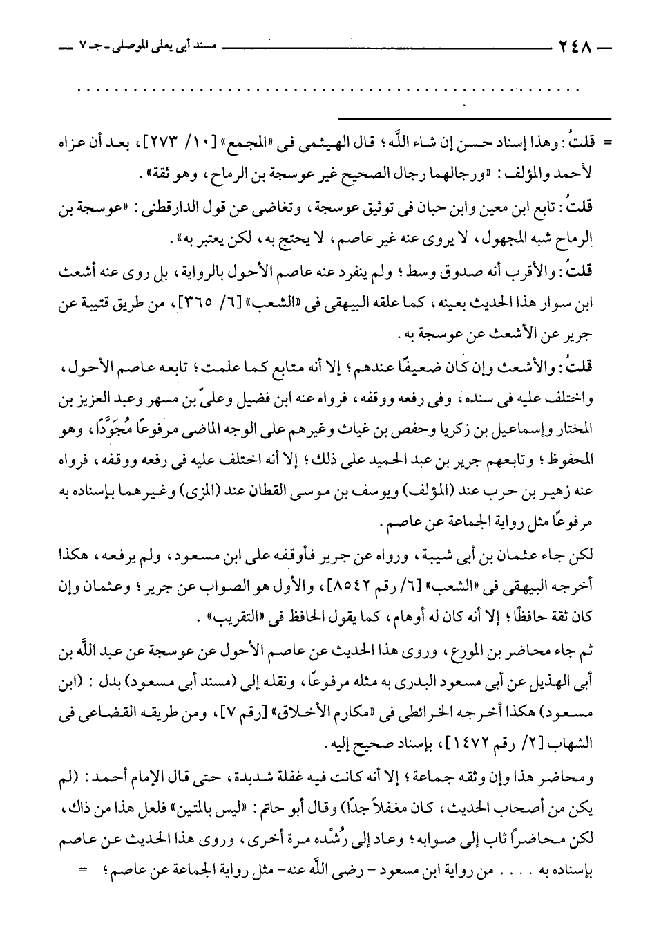 قلتُ: تابع ابن معين وابن حبان في توثيق عوسجة، وتغاضى عن قول الدارقطني: "عوسجة بن الرماح شبه المجهول، لا يروى عنه غير عاصم، لا يحتج به، لكن يعتبر به".