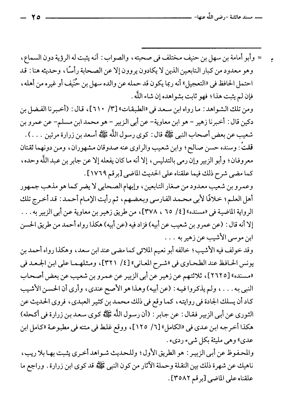وقد خولف فيه الأشيب؛ خالفه أبو نعيم الملائى كما مضى عند ابن سعد، وهكذا رواه أحمد بن يونس الحافظ عند الطحاوى في "شرح المعانى" [٤/ ٣٢١]، ومثلهما على ابن الجعد في "مسنده" [٢٦٢٥]، ثلاثتهم عن زهير عن أبى الزبير عن عمرو بن شعيب عن بعض أصحاب النبي به ... ، ولم يذكروا فيه: (عن أبيه) وهذا هو الأصح عندى، وأرى أن الحسن الأشيب كاد أن يسلك الجادة في روايته، كما وقع في ذلك محمد بن كثير العبدى، فروى الحديث عن الثورى عن أبى الزبير فقال: عن جابر: (أن رسول الله - صلى الله عليه وسلم - كوى سعد بن زرارة في أكحله) هكذا أخرجه ابن عدى في "الكامل" [٦/ ١٢٥]، ووقع غلط في متنه في مطبوعة "كامل ابن عدى" وهى مليئة بكل شئ ردئ.