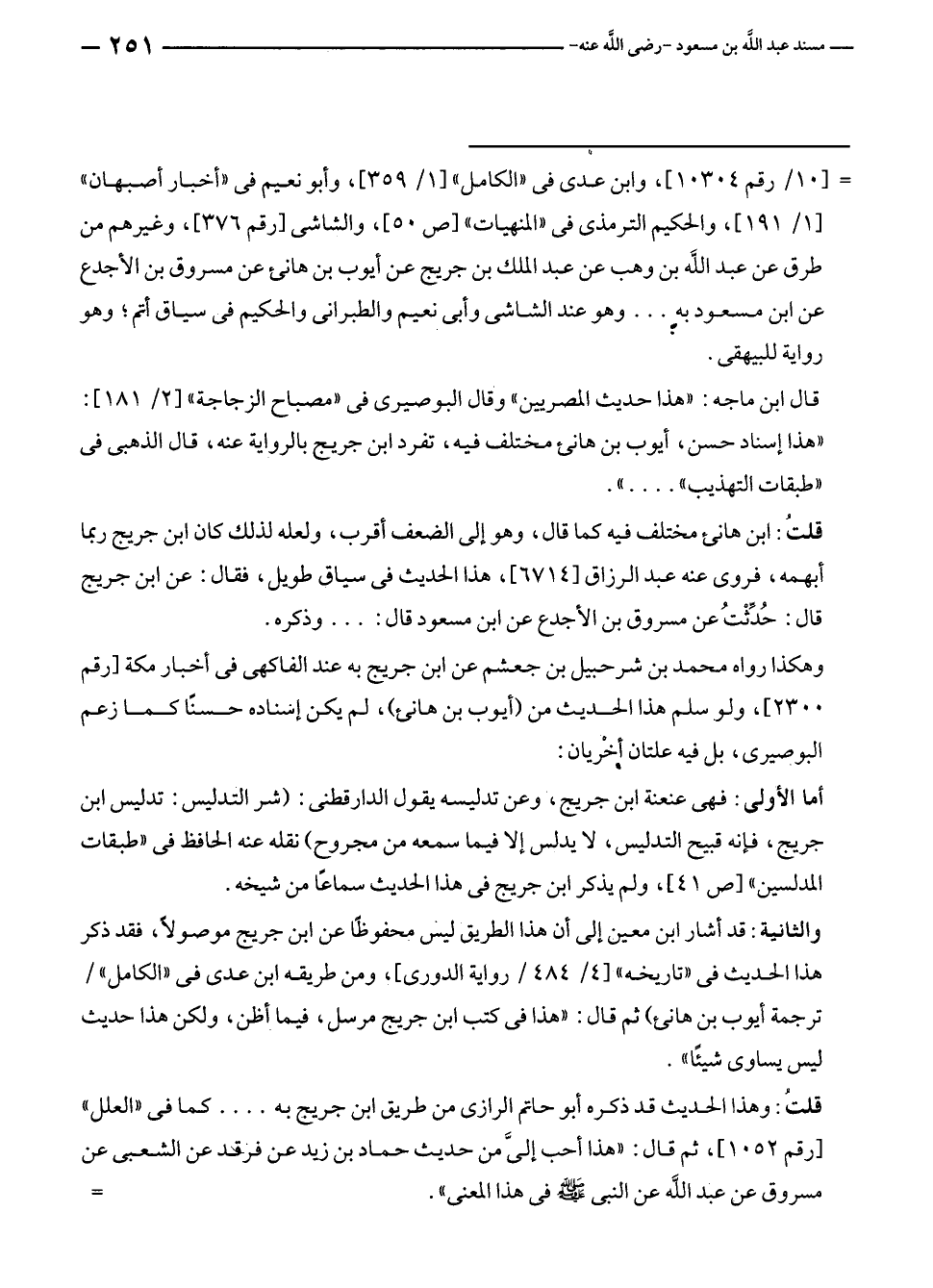 = [١٠/ رقم ١٠٣٠٤]، وابن عدي في "الكامل" [١/ ٣٥٩]، وأبو نعيم في "أخبار أصبهان" [١/ ١٩١]، والحكيم الترمذي في "المنهيات" [ص ٥٠]، والشاشي [رقم ٣٧٦]، وغيرهم من طرق عن عبد الله بن وهب عن عبد الملك بن جريج عن أيوب بن هانئ عن مسروق بن الأجدع عن ابن مسعود به ... وهو عند الشاشى وأبى نعيم والطبراني والحكيم في سياق أتم؛ وهو رواية للبيهقى.