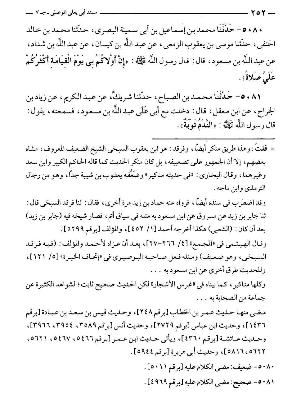 ٥٠٨١ - حَدَّثَنَا محمد بن الصباح، حدّثنا شريكٌ، عن عبد الكريم، عن زياد بن الجراح، عن ابن معقل، قال: دخلت مع أبي عَلَى عبد الله بن مسعود، فسمعته، يقول: قال رسول الله - صلى الله عليه وسلم -: "النَّدَمُ تَوْبَةٌ".