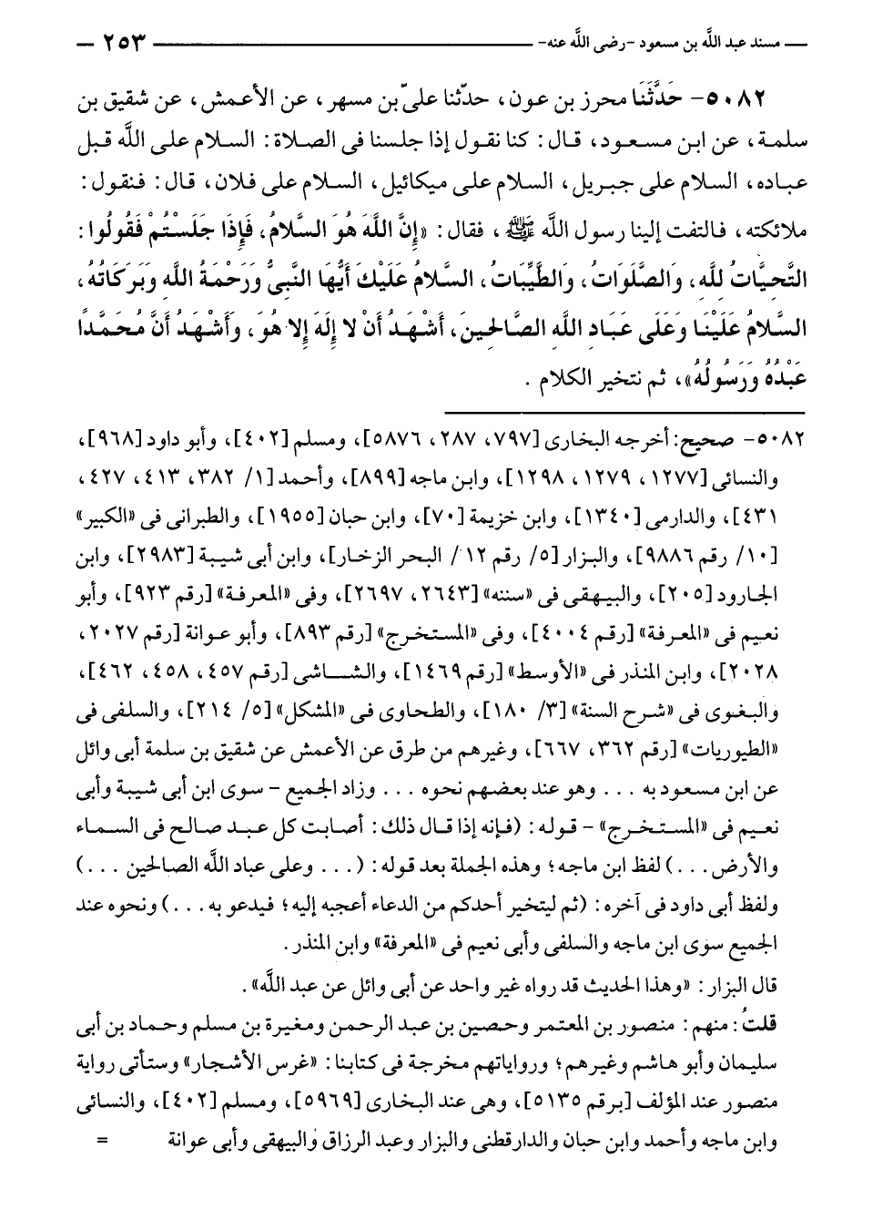 ٥٠٨٢ - حَدَّثَنَا محرز بن عون، حدّثنا عليّ بن مسهر، عن الأعمش، عن شقيق بن سلمة، عن ابن مسعود، قال: كنا نقول إذا جلسنا في الصلاة: السلام على الله قبل عباده، السلام على جبريل، السلام على ميكائيل، السلام على فلان، قال: فنقول: ملائكته، فالتفت إلينا رسول الله - صلى الله عليه وسلم -، فقال: "إنَّ اللَّهَ هُوَ السَّلامُ، فَإِذَا جَلَسْتمْ فَقولُوا: التَّحِيَّاتُ لِلَّهِ، وَالصَّلَوَاتُ، وَالطَّيِّبَاتُ، السَّلامُ عَلَيْكَ أَيُّهَا النَّبِيُّ وَرَحْمَةُ اللَّهِ وَبَرَكَاتهُ، السَّلامُ عَلَيْنَا وَعَلَى عَبَادِ اللَّهِ الصَّالحِينَ، أَشْهَدُ أَنْ لا إِلَهَ إِلَّا هُوَ، وَأَشْهَدُ أَنَّ محَمَّدًا عَبْدُهُ وَرَسُولُهُ"، ثم نتخير الكلام.