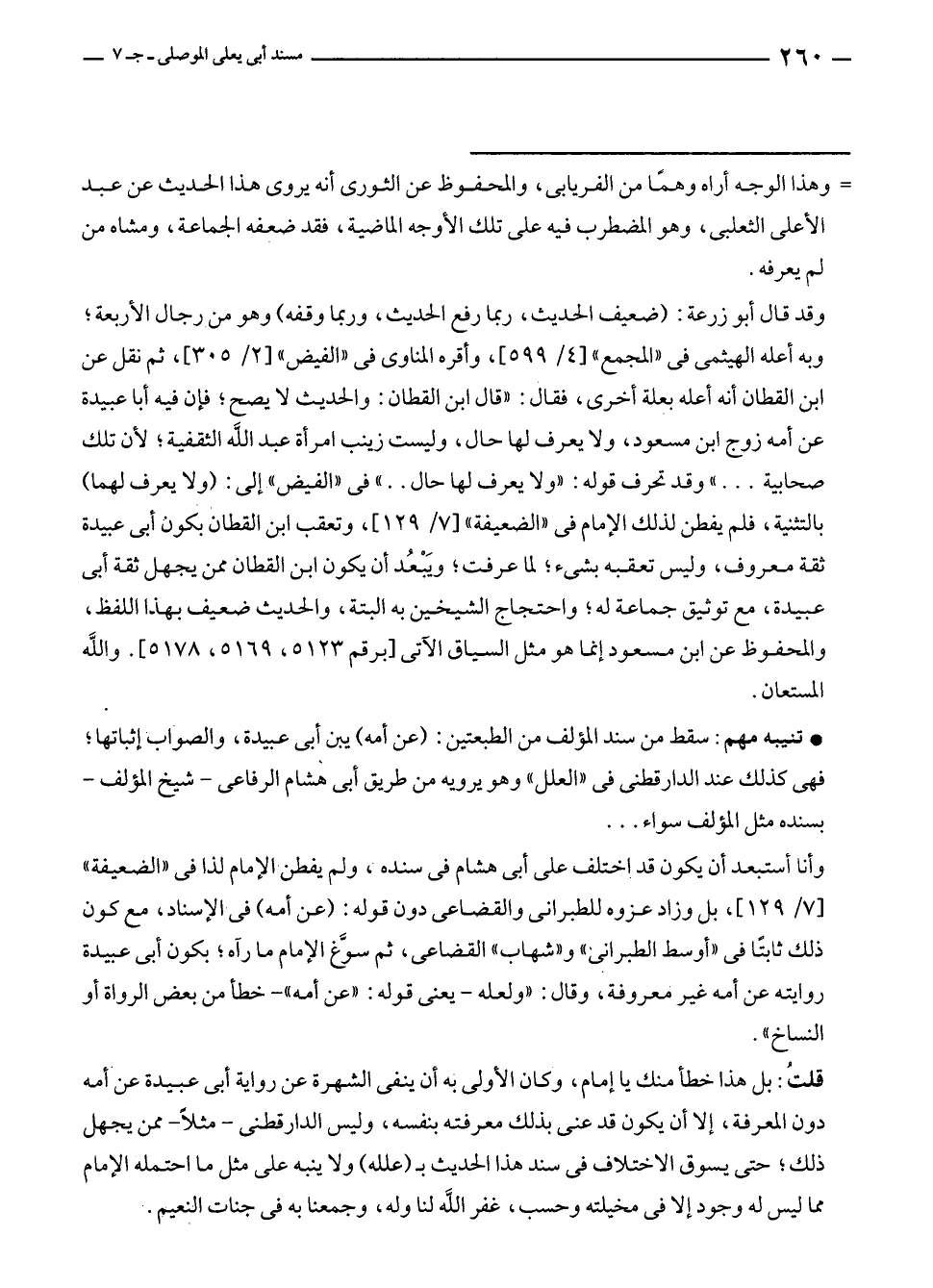 قلتُ: بل هذا خطأ منك يا إمام، وكان الأولى به أن ينفى الشهرة عن رواية أبي عبيدة عن أمه دون المعرفة، إلا أن يكون قد عنى بذلك معرفته بنفسه، وليس الدارقطني - مثلًا - ممن يجهل ذلك؛ حتى يسوق الاختلاف في سند هذا الحديث بـ (علله) ولا ينبه على مثل ما احتمله الإمام مما ليس له وجود إلا في مخيلته وحسب، غفر الله لنا وله، وجمعنا به في جنات النعيم.