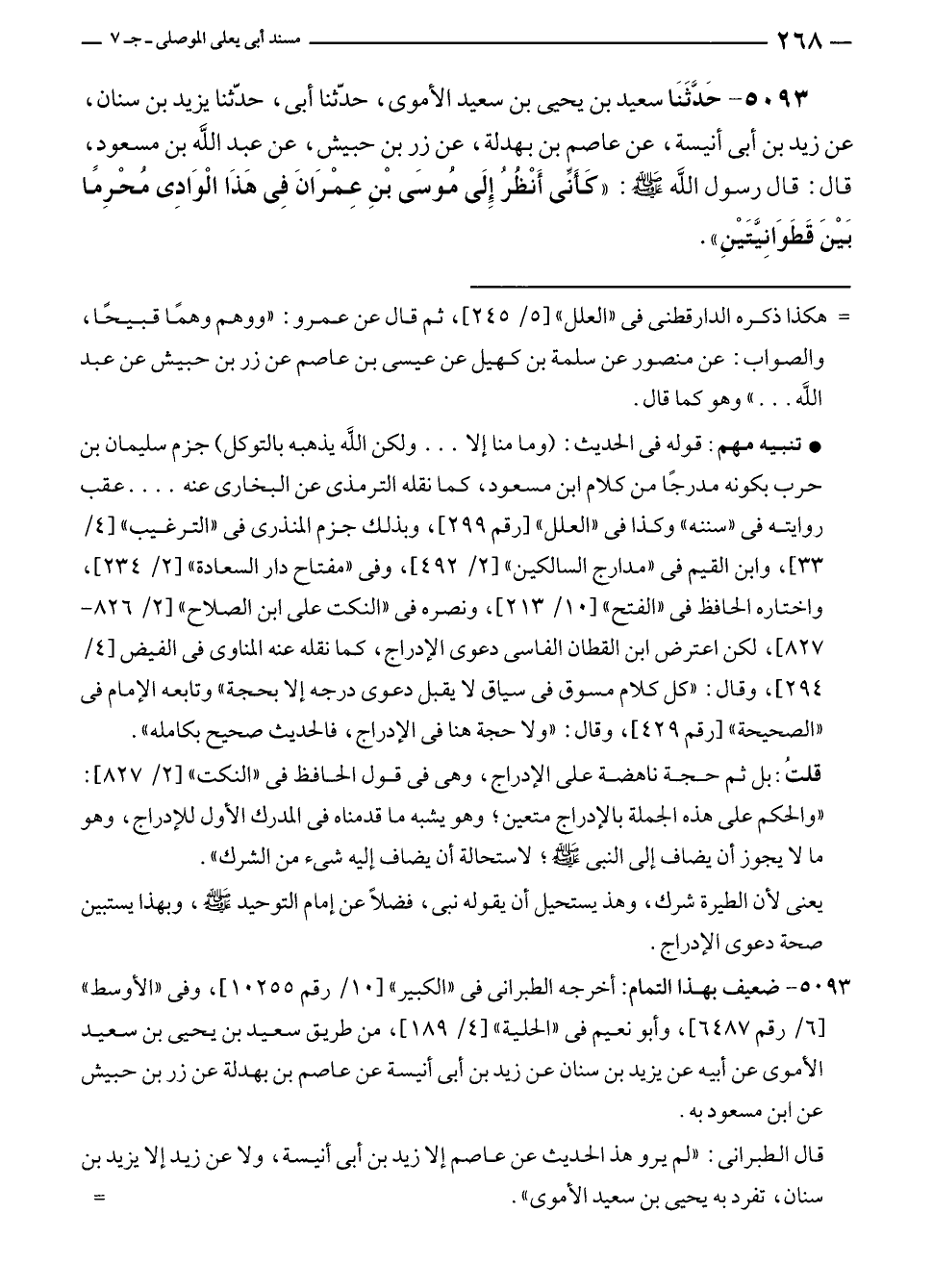 ٥٠٩٣ - حَدَّثَنَا سعيد بن يحيى بن سعيد الأموي، حدّثنا أبي، حدّثنا يزيد بن سنان، عن زيدٍ بن أبي أنيسة، عن عاصم بن بهدلة، عن زر بن حبيش، عن عبد الله بن مسعود، قال: قال رسول الله - صلى الله عليه وسلم -: "كَأَنِّي أَنْظُرُ إِلَى مُوسَى بْنِ عِمْرَانَ فِي هَذَا الْوَادِى مُحْرِمًا بَيْنَ قَطَوَانِيَّتَيْنِ".