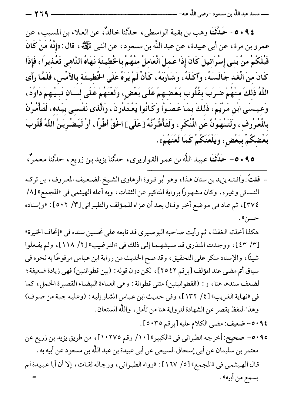 ٥٠٩٤ - حَدَّثَنَا وهب بن بقية الواسطي، حدّثنا خالدٌ، عن العلاء بن المسيب، عن عمرو بن مرة، عن أبي عبيدة، عن عبد الله بن مسعود، عن النبي - صلى الله عليه وسلم -، قال: "إِنَّهُ مَنْ كَانَ قَبْلَكُمْ مِنْ بَنِي إِسرَائِيلَ كَانَ إِذَا عَمِلَ الْعَامِلُ مِنْهُمْ بِالْخَطِيئَةِ نَهَاهُ النَّاهِي تَعْذِيرًا، فَإِذَا كَانَ مِنَ الْغَدِ جَالَسَهُ، وَآكَلَهُ، وَشَارَبَهُ، كَأَنْ لَمْ يَرَهُ عَلَى الخطِيئَةِ بِالأَمْسِ، فَلَمَّا رَأَى اللَّهُ ذَلِكَ مِنْهُمْ ضَرَبَ بِقُلُوبِ بَعْضِهِمْ عَلَى بَعْضٍ، وَلَعْنَهُمْ عَلَى لِسَانِ نَبِيِّهِمْ دَاوُدَ، وَعِيسَى ابْنِ مَرْيَمَ، ذَلِكَ بمَا عَصَوْا وَكَانُوا يَعْتَدُونَ، وَالَّذِي نَفْسِى بِيَدِهِ، لَتَأْمُرُنَّ بِالمعْرُوفِ، وَلَتَنْهَوُنَّ عَنِ الْمُنْكَرِ، وَلَتَأطُرُنَّهُ [عَلَى] الحقِّ أَطْرًا، أَوْ لَيَضْرِبَنَّ اللَّهُ قُلُوبَ بَعْضِكُمْ بِبَعْضٍ، وَيَلْعَنَكُمْ كمَا لَعَنَهُمْ".