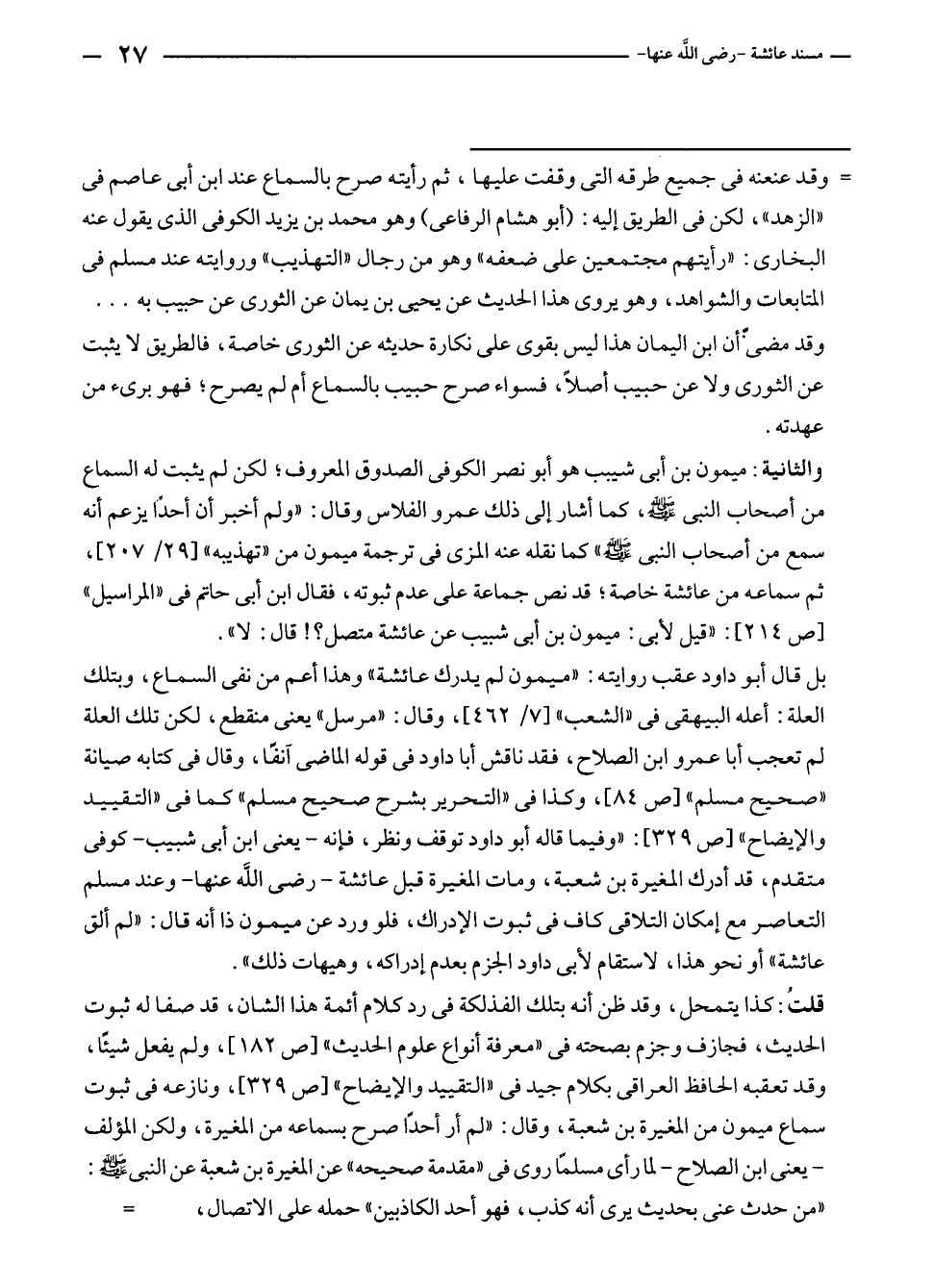 بل قال أبو داود عقب روايته: "ميمون لم يدرك عائشة" وهذا أعم من نفى السماع، وبتلك العلة: أعله البيهقى في "الشعب" [٧/ ٤٦٢]، وقال: "مرسل" يعنى منقطع، لكن تلك العلة لم تعجب أبا عمرو بن الصلاح، فقد ناقش أبا داود في قوله الماضى آنفًا، وقال في كتابه صيانة "صحيح مسلم" [ص ٨٤]، وكذا في "التحرير بشرح صحيح مسلم" كما في "التقييد والإيضاح" [ص ٣٢٩]: "وفيما قاله أبو داود توقف ونظر، فإنه - يعنى ابن أبى شبيب - كوفى متقدم، قد أدرك المغيرة بن شعبة، ومات المغيرة قبل عائشة - رضى الله عنها - وعند مسلم التعاصر مع إمكان التلاقى كاف في ثبوت الإدراك، فلو ورد عن ميمون ذا أنه قال: "لم ألق عائشة" أو نحو هذا، لاستقام لأبى داود الجزم بعدم إدراكه، وهيهات ذلك".