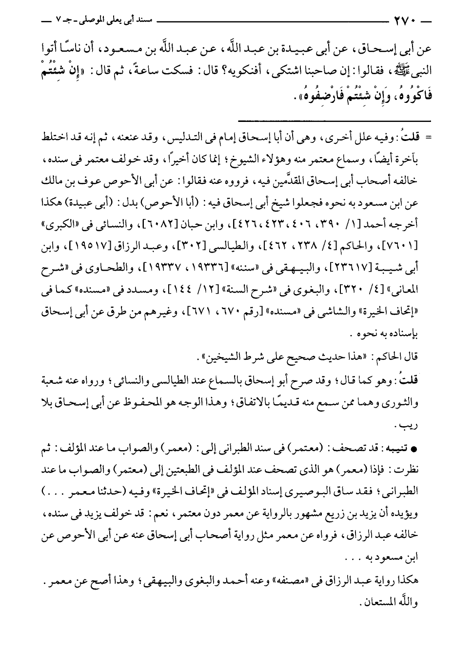• تنبيه: قد تصحف: (معتمر) في سند الطبراني إلى: (معمر) والصواب ما عند المؤلف: ثم نظرت: فإذا (معمر) هو الذي تصحف عند المؤلف في الطبعتين إلى (معتمر) والصواب ما عند الطبراني؛ فقد ساق البوصيري إسناد المؤلف في "إتحاف الخيرة" وفيه (حدثنا معمر ... ) ويؤيده أن يزيد بن زريع مشهور بالرواية عن معمر دون معتمر، نعم: قد خولف يزيد في سنده، خالفه عبد الرزاق، فرواه عن معمر مثل رواية أصحاب أبي إسحاق عنه عن أبي الأحوص عن ابن مسعود به ...