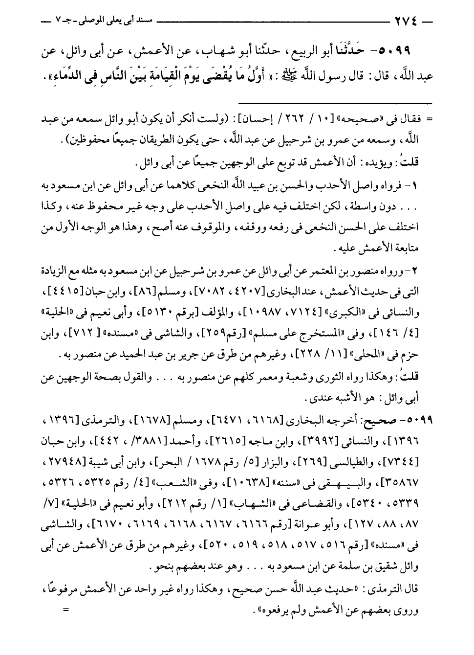 ٥٠٩٩ - حَدَّثَنَا أبو الربيع، حدّثنا أبو شهاب، عن الأعمش، عن أبي وائل، عن عبد الله، قال: قال رسول الله - صلى الله عليه وسلم -: "أَوَّلُ مَا يُقْضَى يَوْمَ الْقِيَامَةِ بَيْنَ النَّاسِ فِي الدِّمَاءِ".