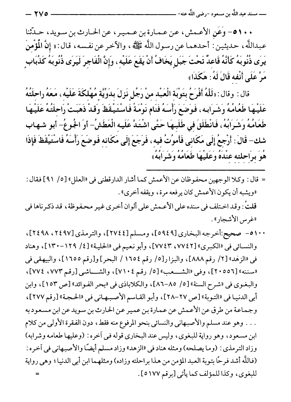 ٥١٠٠ - صحيح: أخرجه البخاري [٥٩٤٩]، ومسلم [٢٧٤٤]، والترمذي [٢٤٩٧، ٢٤٩٨]، والنسائي في "الكبرى" [٧٧٤٢، ٧٧٤٣]، وأبو نعيم في "الحلية" [٤/ ١٢٩ - ١٣٠]، وهناد في "الزهد" [٢/ رقم ٨٨٨]، والبزار [٥/ رقم ١٦٥٤/ البحر] و [رقم ١٦٥٥]، والبيهقي في "سننه" [٢٠٥٥٦]، وفي "الشعب" [٥/ رقم ٧١٠٤]، والشاشي [رقم ٧٧٣، ٧٧٤]، والبغوي في "شرح السنة" [٥/ ٨٥ - ٨٦]، والكلاباذي في "بحر الفوائد" [ص ١٥٣]، وابن أبي الدنيا في "التوبة" [ص ٢٧ - ٢٨]، وأبو القاسم الأصبهانى في "الحجة" [رقم ٢٧٧]، وجماعة من طرق عن الأعمش عن عمارة بن عمير عن الحارث بن سويد عن ابن مسعود به ... وهو عند مسلم والأصبهاني والنسائي بنحو المرفوع منه فقط، دون الفقرة الأولى من كلام ابن مسعود، وهو رواية للبغوي، وليس عند البخاري قوله في آخره: (وعليها طعامه وشرابه) وزاد الترمذي: (وما يصلحه) ومثله هناد في "الزهد" وزاد مسلم أيضًا والأصبهاني في آخره: (فاللَّه أشد فرحًا بتوبة العبد المؤمن من هذا براحلته وزاده) ومثلهما ابن أبي الدنيا؛ وهى رواية للبغوي، وكذا للمؤلف كما يأتي [برقم ٥١٧٧]. =