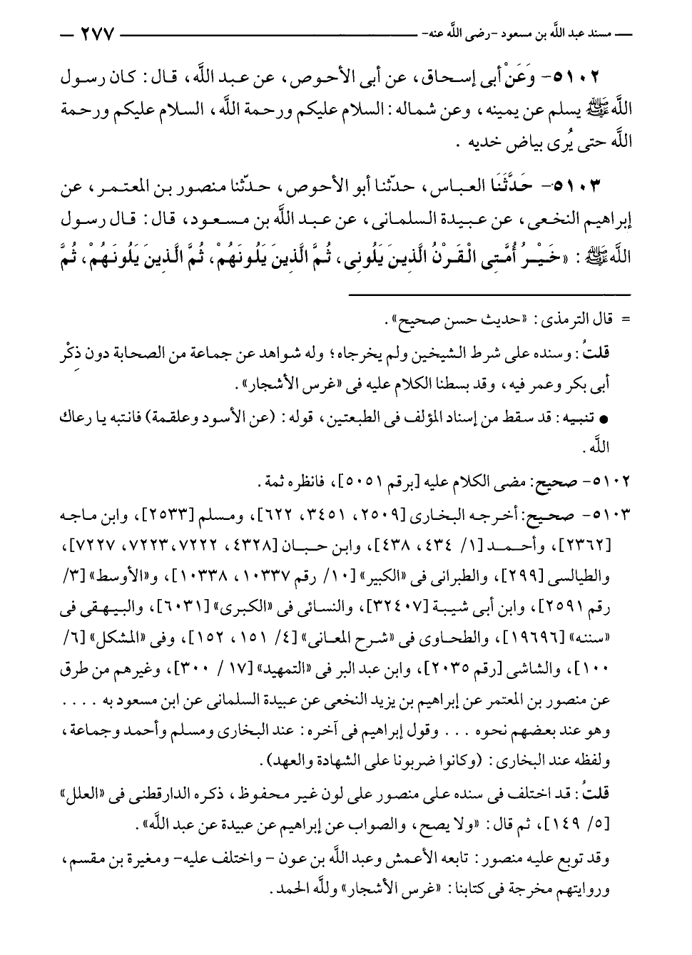 ٥١٠٣ - حَدَّثَنَا العباس، حدّثنا أبو الأحوص، حدّثنا منصور بن المعتمر، عن إبراهيم النخعي، عن عبيدة السلماني، عن عبد الله بن مسعود، قال: قال رسول الله - صلى الله عليه وسلم -: "خَيْرُ أُمَّتِي الْقَرْنُ الَّذِينَ يَلُونِي، ثُمَّ الَّذِينَ يَلُونَهُمْ، ثُمَّ الَّذِينَ يَلُونَهُمْ، ثُمَّ