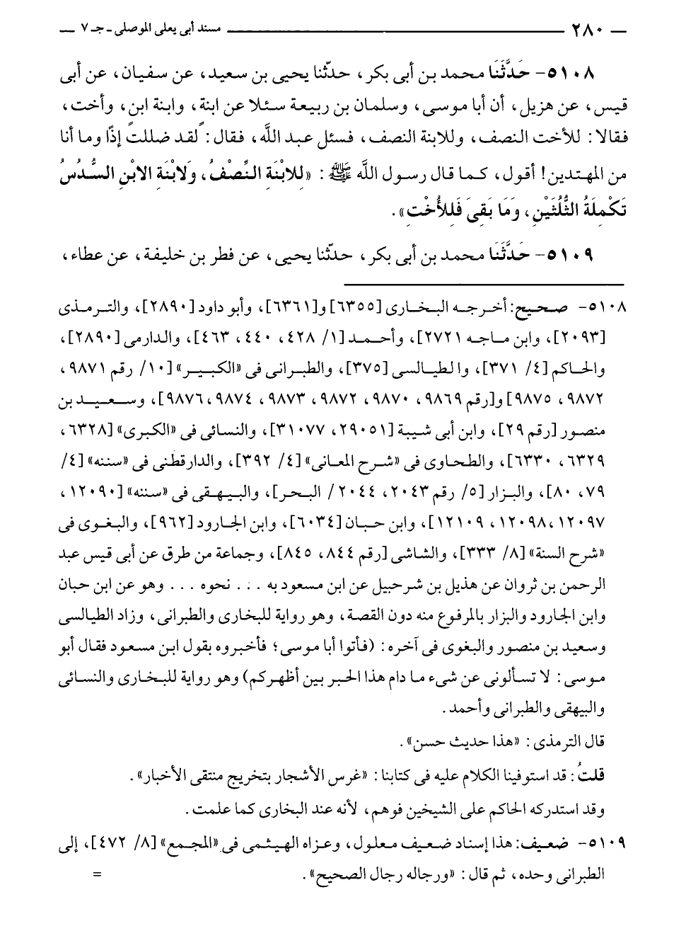٥١٠٨ - صحيح: أخرجه البخاري [٦٣٥٥] و [٦٣٦١]، وأبو داود [٢٨٩٠]، والترمذي [٢٠٩٣]، وابن ماجه [٢٧٢]، وأحمد [١/ ٤٢٨، ٤٤٠، ٤٦٣]، والدارمي [٢٨٩٠]، والحاكم [٤/ ٣٧١]، والطيالسى [٣٧٥]، والطبراني في "الكبير" [١٠/ رقم ٩٨٧١، ٩٨٧٢، ٩٨٧٥] و [رقم ٩٨٦٩، ٩٨٧٠، ٩٨٧٢، ٩٨٧٣، ٩٨٧٤، ٩٨٧٦]، وسعيد بن منصور [رقم ٢٩]، وابن أبي شيبة [٢٩٠٥١، ٣١٠٧٧]، والنسائي في "الكبرى" [٦٣٢٨، ٦٣٢٩، ٦٣٣٠]، والطحاوي في "شرح المعاني" [٤/ ٣٩٢]، والدارقطني في "سننه" [٤/ ٧٩، ٨٠]، والبزار [٥/ رقم ٢٠٤٣، ٢٠٤٤/ البحر]، والبيهقي في "سننه" [١٢٠٩٠، ١٢٠٩٧، ١٢٠٩٨، ١٢١٠٩]، وابن حبان [٦٠٣٤]، وابن الجارود [٩٦٢]، والبغوي في "شرح السنة" [٨/ ٣٣٣]، والشاشي [رقم ٨٤٤، ٨٤٥]، وجماعة من طرق عن أبي قيس عبد الرحمن بن ثروان عن هذيل بن شرحبيل عن ابن مسعود به ... نحوه ... وهو عن ابن حبان وابن الجارود والبزار بالمرفوع منه دون القصة، وهو رواية للبخارى والطبراني، وزاد الطيالسي وسعيد بن منصور والبغوي في آخره: (فأتوا أبا موسى؛ فأخبروه بقول ابن مسعود فقال أبو موسى: لا تسألونى عن شيء ما دام هذا الحبر بين أظهركم) وهو رواية للبخارى والنسائي والبيهقي والطبراني وأحمد.