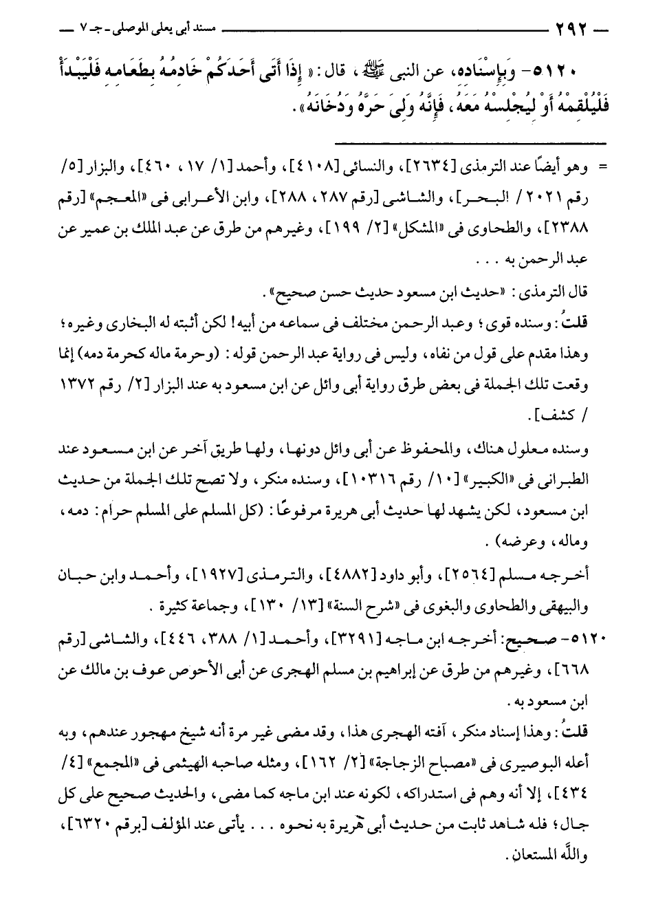 ٥١٢٠ - وَبِإِسنَادِه، عن النبي - صلى الله عليه وسلم -، قال: "إذَا أَتَى أَحَدَكُمْ خَادِمُهُ بِطَعَامِهِ فَلْيَبْدَأْ فَلْيلْقِمْهُ أَوْ لِيجْلِسْهُ مَعَهُ، فَإِنَّه وَلِىَ حَرَّهُ وَدُخَانَهُ".