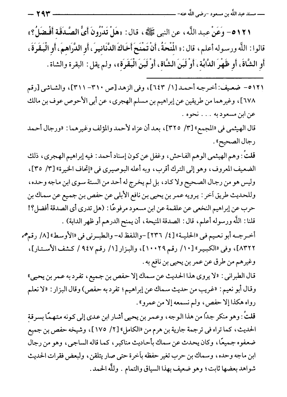 قلتُ: وهم الهيثمي الوهم الفاحش، وغفل عن كون إسناد أحمد: فيه إبراهيم الهجري، ذلك الضعيف المعروف، وهو إلى الترك أقرب، وبه أعله البوصيري في "إتحاف الخيرة" [٣/ ٣٥] وليس هو من رجال الصحيح ولا كاد، بل لم يخرج له أحد من الستة سوى ابن ماجه وحده، وللحديث طريق آخر: يرويه عمر بن يحيى بن نافع الأبلى عن حفص بن جميع عن سماك بن حرب عن إبراهيم النخعى عن علقمة عن ابن مسعود مرفوعًا: (هل تدرى أي الصدقة أفضل؟! قلنا: الله ورسوله أعلم، قال: الصدقة المنيحة، أن يمنح الدرهم أو ظهر الدابة).