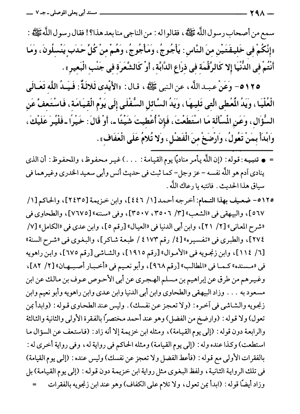 ٥١٢٥ - ضعيف بهذا التمام: أخرجه أحمد [١/ ٤٤٦]، وابن خزيمة [٢٤٣٥]، والحاكم [١/ ٥٦٧]، والبيهقي في "الشعب" [٣/ ٣٥٠٦، ٣٥٠٧]، وفي "سننه" [٧٦٧٥]، والطحاوي في "شرح المعاني" [٢/ ٢١]، وابن أبي الدنيا في "العيال" [رقم ٥]، وابن عدي في "الكامل" [٧/ ٢٧٤]، والطبري في "تفسيره" [٤/ رقم ٤١٧٣/ طبعة شاكر]، والبغوي في "شرح السنة" [٦/ ١١٤]، وابن زنجويه في "الأموال" [رقم ١٩١٥]، والشاشى [رقم ٦٧٥]، وابن راهويه في "مسنده" كما في "المطالب" [رقم ٩٦٨]، وأبو نعيم في "أخبار أصبهان" [٢/ ٨٢]، وغيرهم من طرق عن إبراهيم بن مسلم الهجري عن أبي الأحوص عوف بن مالك عن ابن مسعود به ... وزاد البيهقي والطحاوي وابن أبي الدنيا وابن عدي وابن راهويه وأبو نعيم وابن زنجويه والشاشى في آخره: (ولا تعجز عن نفسك). وليس عند الطحاوى قوله: (وابدأ بمن تعول) ولا قوله: (وارضخ من الفضل) وهو عند أحمد مختصرًا بالفقرة الأولى والثانية والثالثة والرابعة دون قوله: (إلى يوم القيامة)، ومثله ابن خزيمة إلا أنه زاد: (فاستعف عن السؤال ما استطعت) وكذا عنده وله: (إلى يوم القيامة) ومثله الحاكم في رواية له، وفي رواية أخرى له: بالفقرات الأولى مع قوله: (فأعط الفضل ولا تعجز عن نفسك) وليس عنده: (إلى يوم القيامة) في تلك الرواية الثانية، ولفظ البغوي مثل رواية ابن خزيمة دون قوله: (إلى يوم القيامة) بل وزاد أيضًا قوله: (ابدأ بمن تعول، ولا تلام على الكفاف) وهو عند ابن زنجويه بالفقرات=