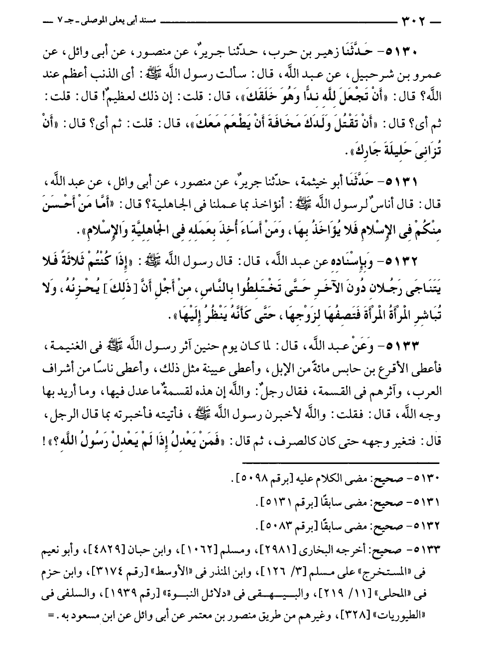 ٥١٣٠ - حَدَّثَنَا زهير بن حرب، حدّثنا جريرٌ، عن منصور، عن أبي وائل، عن عمرو بن شرحبيل، عن عبد الله، قال: سألت رسول الله - صلى الله عليه وسلم -: أي الذنب أعظم عند الله؟ قال: "أَنْ تَجْعَلَ لِلَّهِ نِدًّا وَهُوَ خَلَقَكَ"، قال: قلت: إن ذلك لعظيمٌ! قال: قلت: ثم أي؟ قال: "أَنْ تَقْتُلَ وَلَدَكَ مَخَافَةَ أَنْ يَطْعَمَ مَعَكَ"، قال: قلت: ثم أي؟ قال: "أَنْ تُزَانِىَ حَلِيلَةَ جَارِكَ".